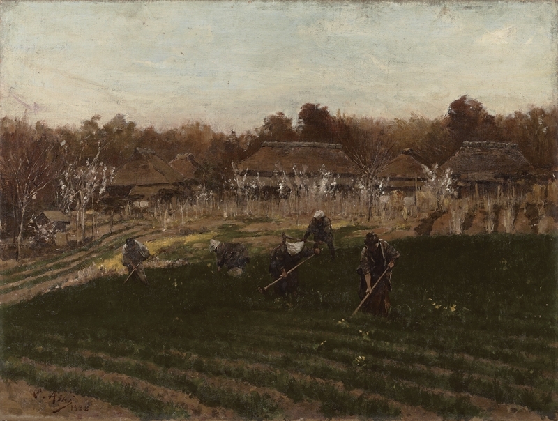 淺井忠受到歐洲巴比松畫派的影響,擅長表現明亮的鄉村風景,此次來展的〈春畝〉(圖3)一圖為赴法之前所作,為其早期作品,深受馮塔內希自然主義的畫風所影響,展現樸實的農村風情。前景為農人在一大片綠油油的早春麥田裡忙碌著,觀者彷彿站立於田裡鬆軟的泥土上向前望去,農田後方為日本早期農村中常見的葺屋頂,此畫被譽為飄著新鮮土壤氣息的農村風景畫,於第一回明治美術會展出,相當具有代表性。
