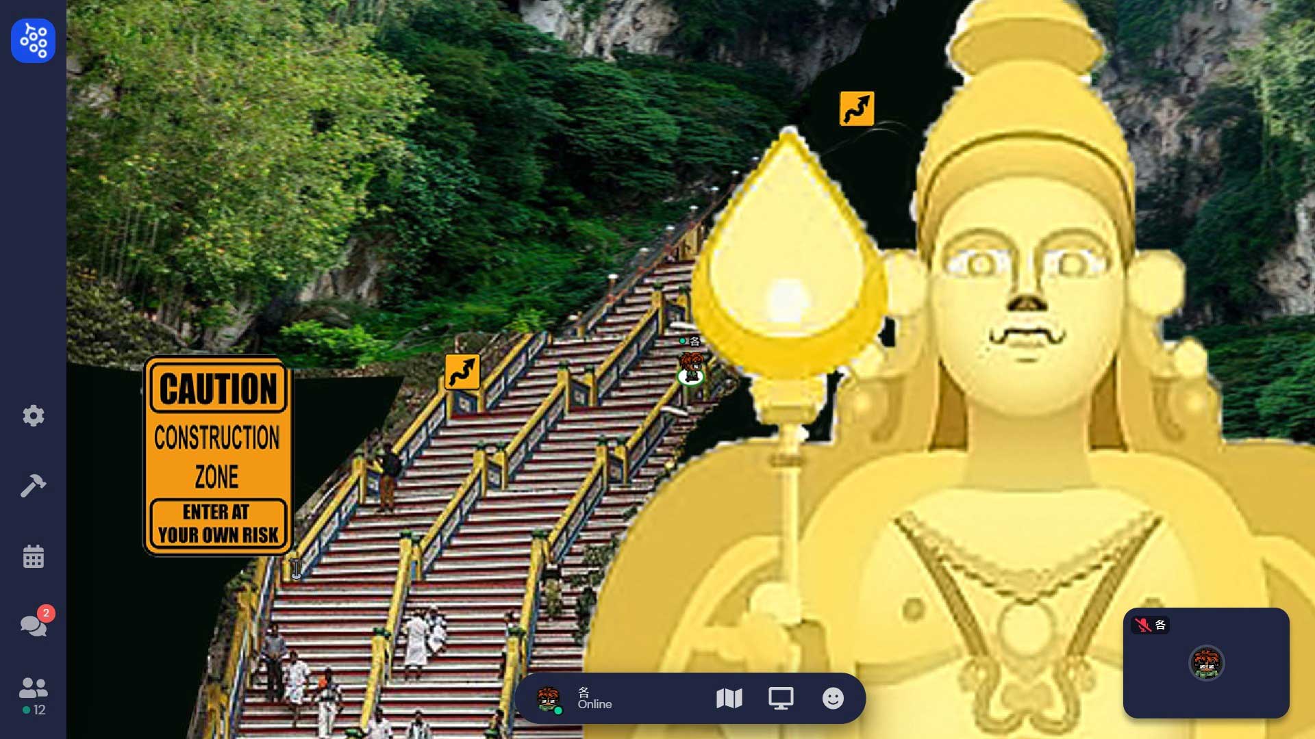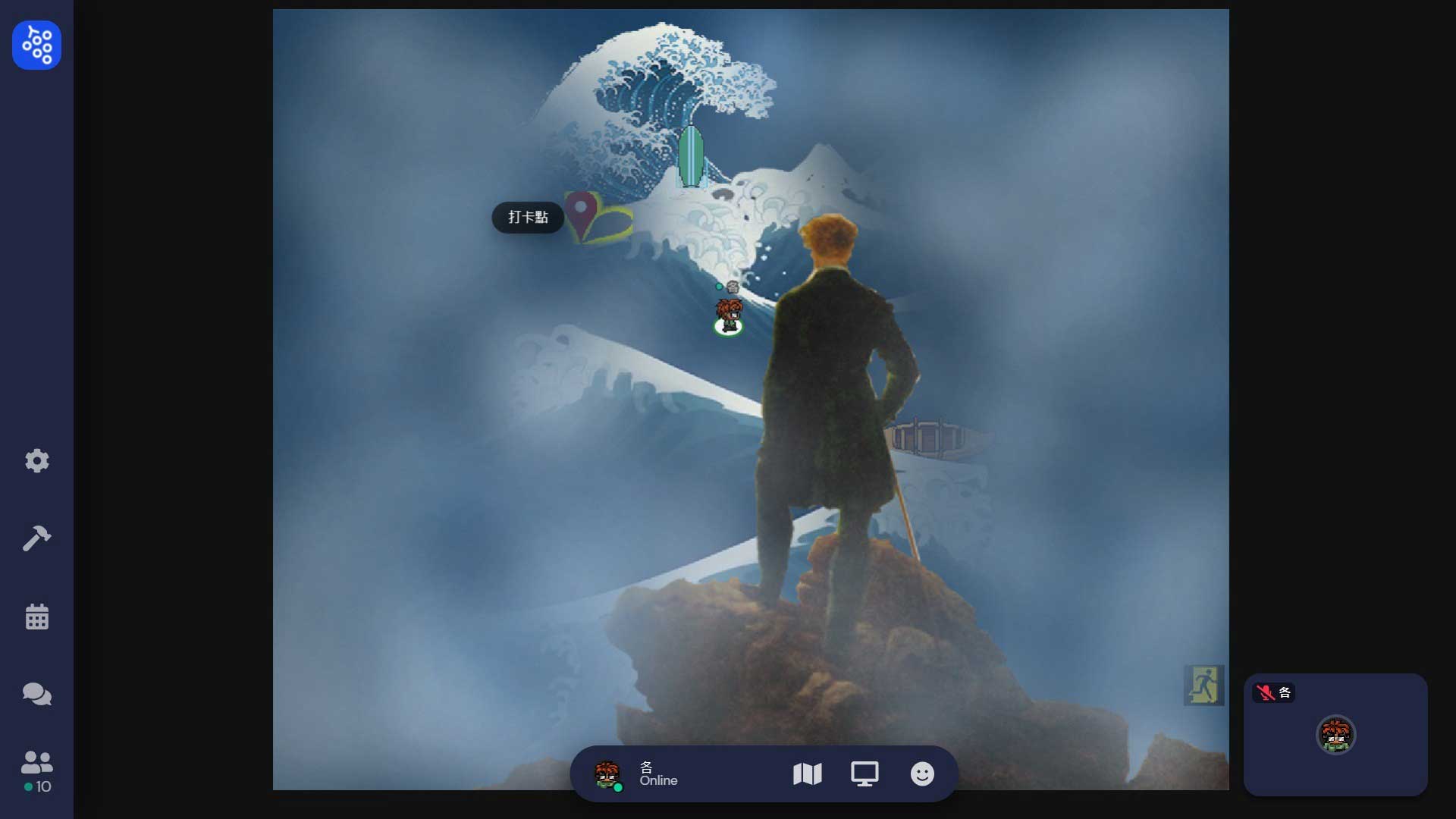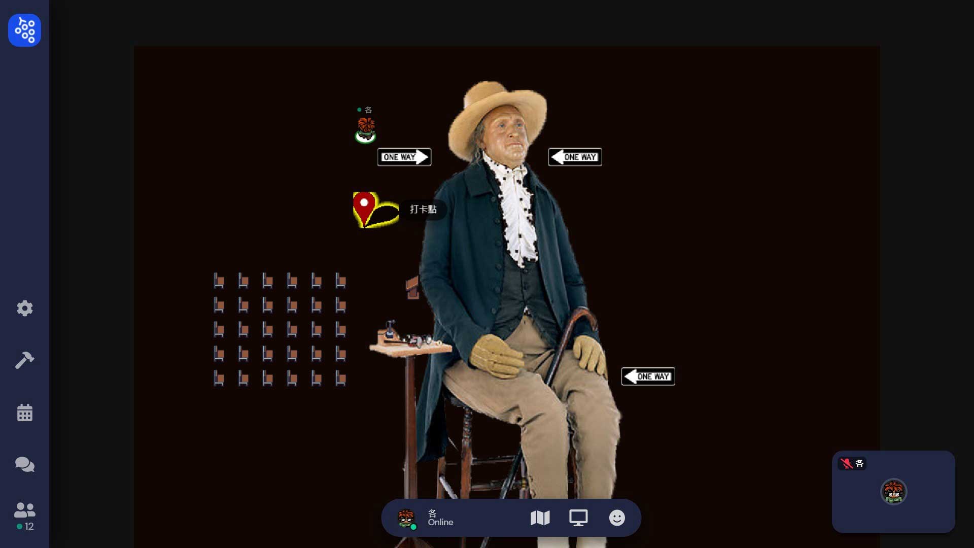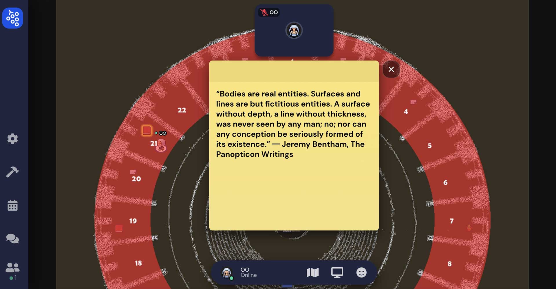 包括可能在山洞洞窟無法來去自如,面對隱性的出入口必須小心移動,以免陷阱般的亂入到不同的場景。其中一個場景更設定為環形監獄,刻意隔間不讓人集結,也挑戰了Gather.town設定聚集的意涵。