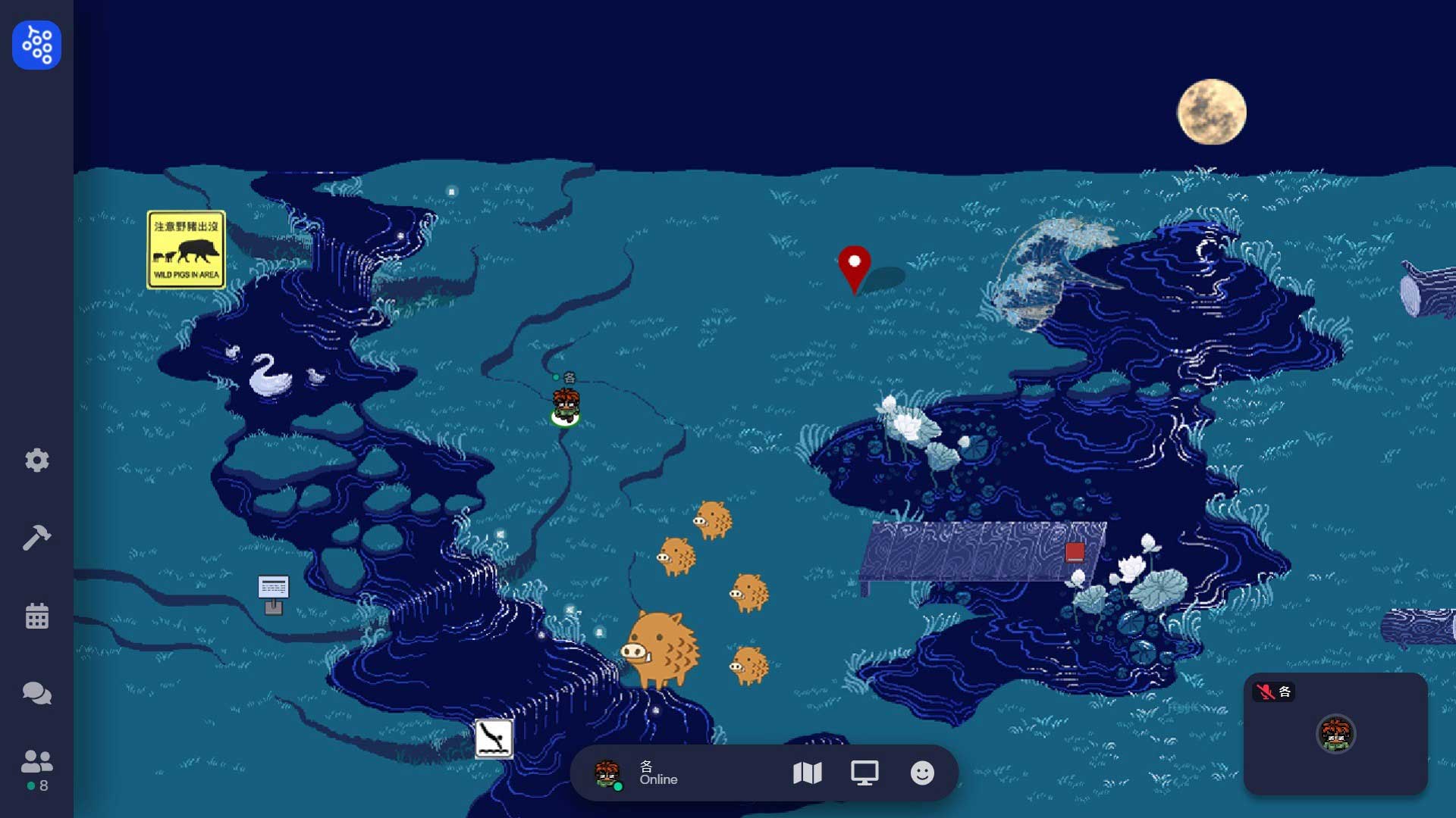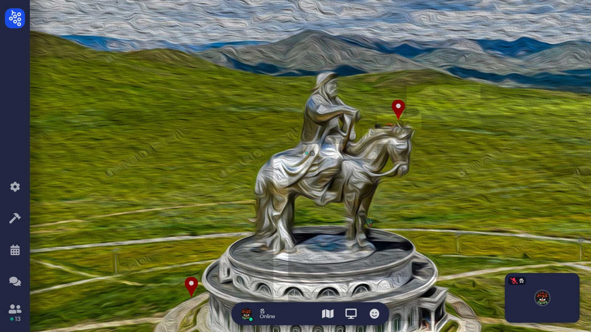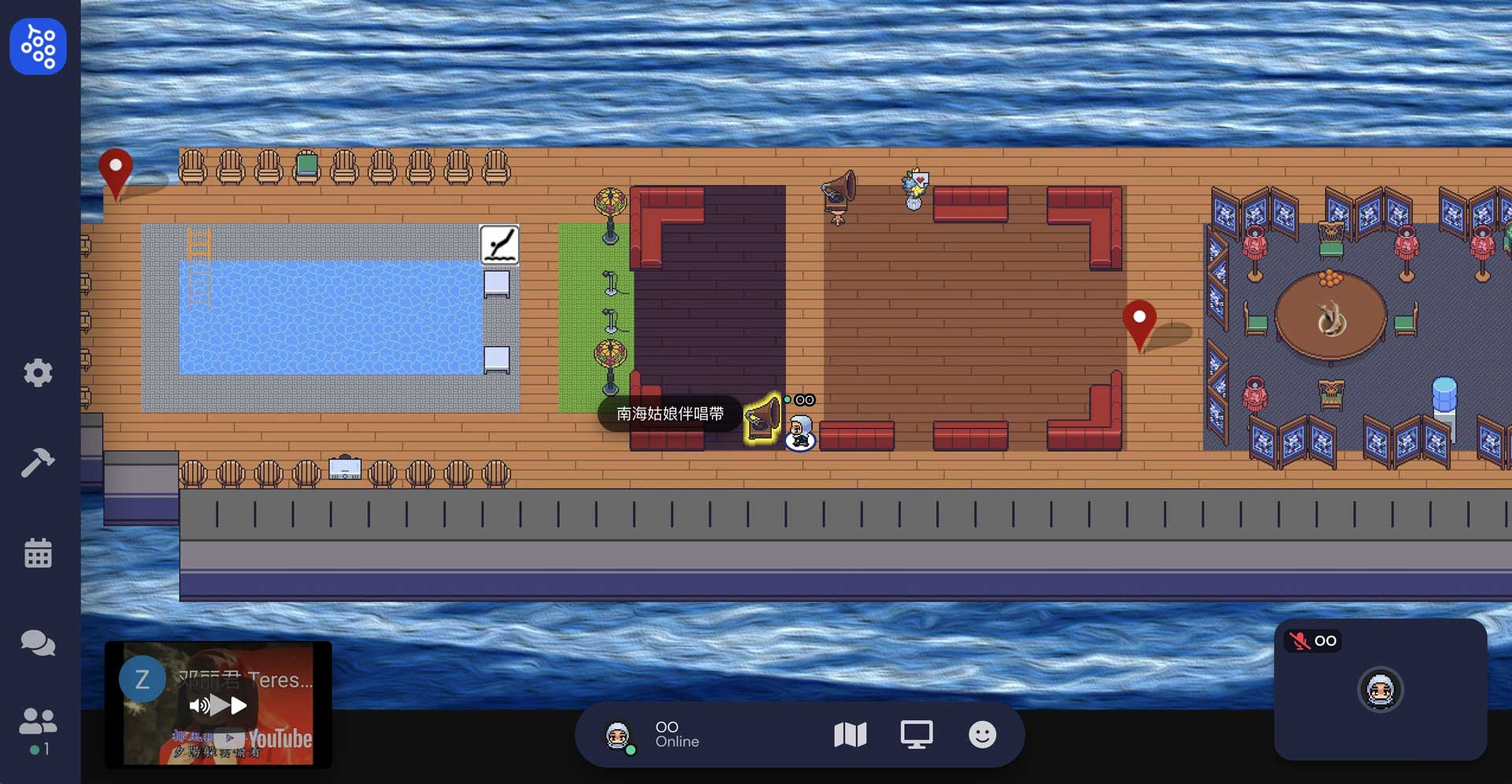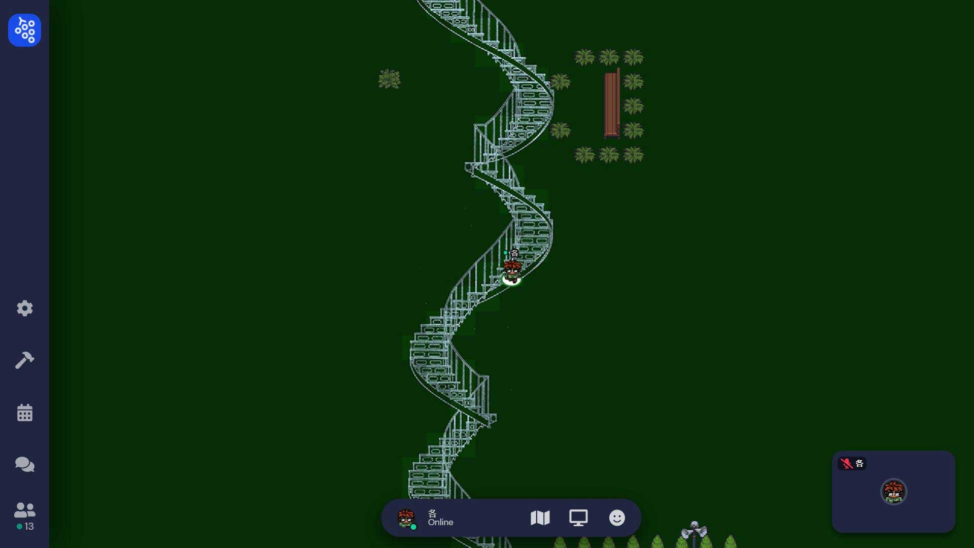 包括可能在山洞洞窟無法來去自如,面對隱性的出入口必須小心移動,以免陷阱般的亂入到不同的場景。其中一個場景更設定為環形監獄,刻意隔間不讓人集結,也挑戰了Gather.town設定聚集的意涵。
