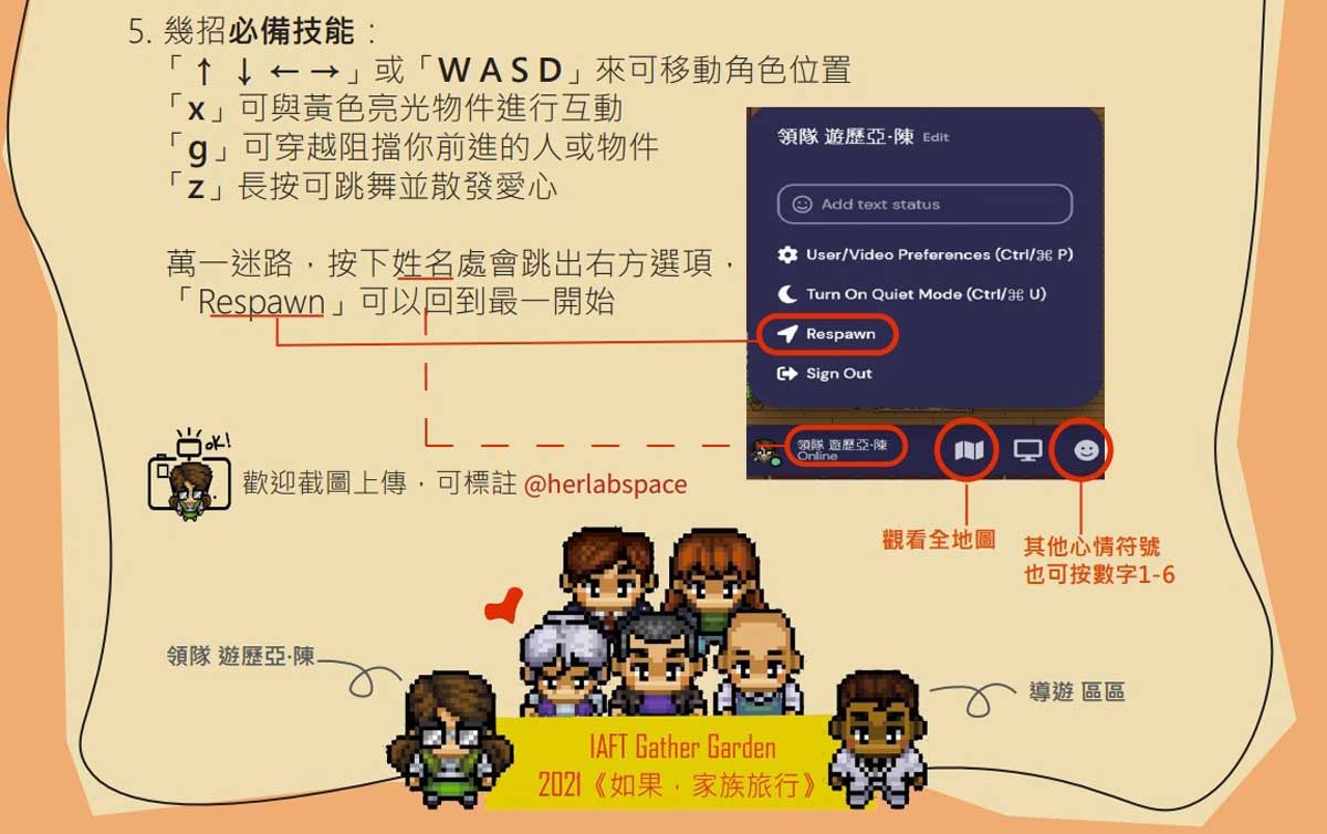 直到7月中參與「她的實驗室空間集」的《如果,家族旅行》之「平面代號:IAFT Gather Garden」的線上導覽活動,因為這個創造性案例的出現,對比出台灣氾濫的線上展演模式其實已逐漸有樣板化的趨勢。當我們已經慣性以為線上呈現大概就是某種樣態,「想像的限制」已經無形產生。而《如果,家族旅行》之「平面代號:IAFT Gather Garden」的呈現形式,回答了「線上活動」仍有巨大的可能性尚待開發。