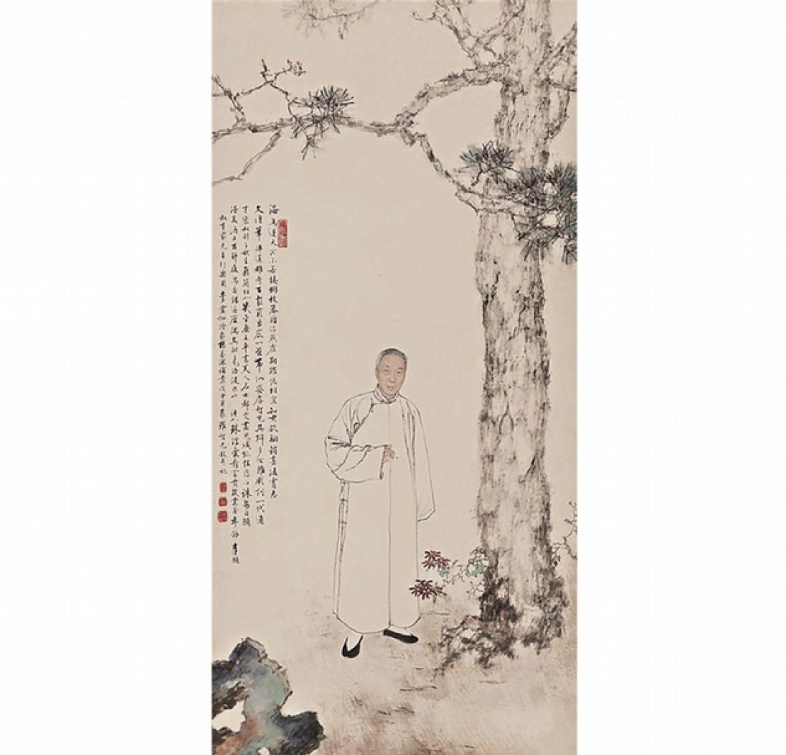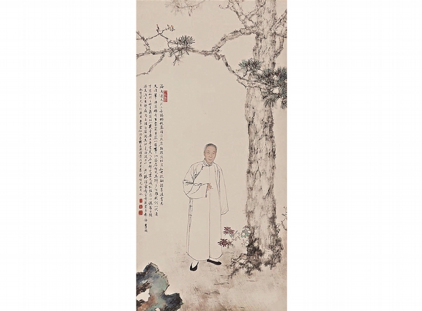 有趣的是,此次展出作品多為友人之間的交誼應酬之作,可見當時澳門文人圈的交遊活動,如李靈伽與楊善深合作的〈羅叔重行樂圖〉,一人畫松,一人細描人物面容,神韻精妙,衣著以白描畫成,展現文人高風亮節的氣質。羅叔重為書法篆刻家,他與澳門藝文人士交往密切,本次展覽中亦有他刻贈嶺南派畫家楊善深的印章,其篆體古樸剛健,刀風富有拙趣。潘筱瑛的畫風則是中西混融,其多以書法用筆畫水彩,亦有水墨創作,看似水墨畫的筆觸卻混入各色水彩,實驗性強烈。雖然經歷過西方文化的洗禮,澳門文人依舊堅持拿著毛筆寫字、作畫,默默紮根。