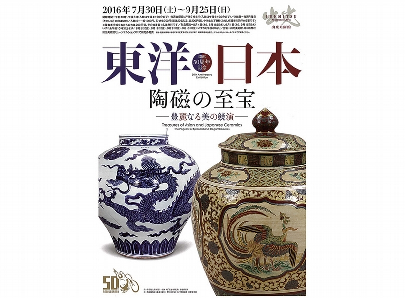 2016年7月30日至9月25日,為慶祝建館50週年,出光美術館特別企劃「東洋.日本陶瓷之至寶―華麗之美的競技」(暫譯)展覽,展出有中國、朝鮮及日本本土的陶瓷作品。展覽一共分為六大單元,分別介紹普世對於陶瓷之美的理解、中國及日本陶瓷史、茶道具、陶瓷中的東西交流外,並在最後一單元介紹了日本近現代陶藝大師板谷波山的作品。展覽中可見有唐三彩、景德鎮青花、高麗青瓷、日本中古窯陶器等,內容紛呈,集館藏之大成。