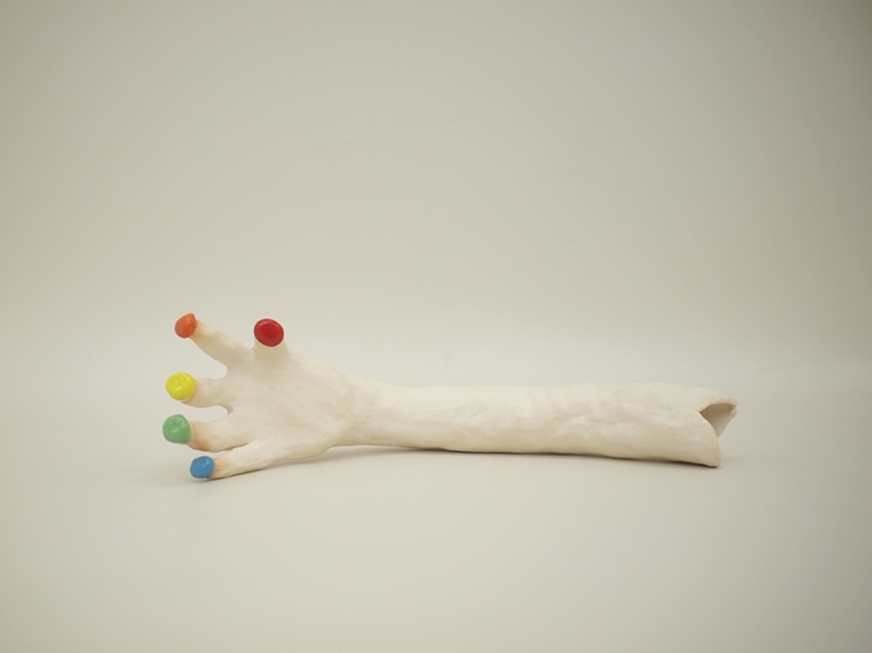 創作若是遇到瓶頸,便會開始找自己身上還有什麼可以拿來發揮的,在做陶的時候,有天上課不曉得要做什麼,就做了一隻手(吃五口),在五根手指頭上面黏了像是糖果的東西,上色之後,燒製成作品;這件作品算是「手」系列的開端。