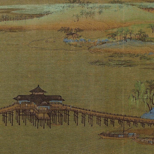引人注目的是,畫中全為江南一帶的湖光山色及人文景觀,包括大量建築及構件;其中最醒目者,莫過於畫卷前半中央的一座木構長橋,橋中央有一座兩層樓高的亭閣(圖5)。倘由其外觀判斷,應該就是位在蘇州南面吳江中、建於慶曆八年(1048)的利往橋和垂虹亭。此座巨大長橋屢見於宋代文獻中,不僅士大夫蘇舜欽、王安石曾為之歌詠,大書法家米芾於傳世墨蹟〈蜀素帖〉亦曾提到垂虹亭。王希孟以寫實技法逼真呈現這一片色彩絢麗、如仙境般的江南風光,或可視為當時宮廷對江南文化的一種渴慕,又或者意欲藉由描繪天子治下遼闊疆域的和平繁榮景象,傳達出宋代王朝將如繪畫般真實美好,垂世不朽!
