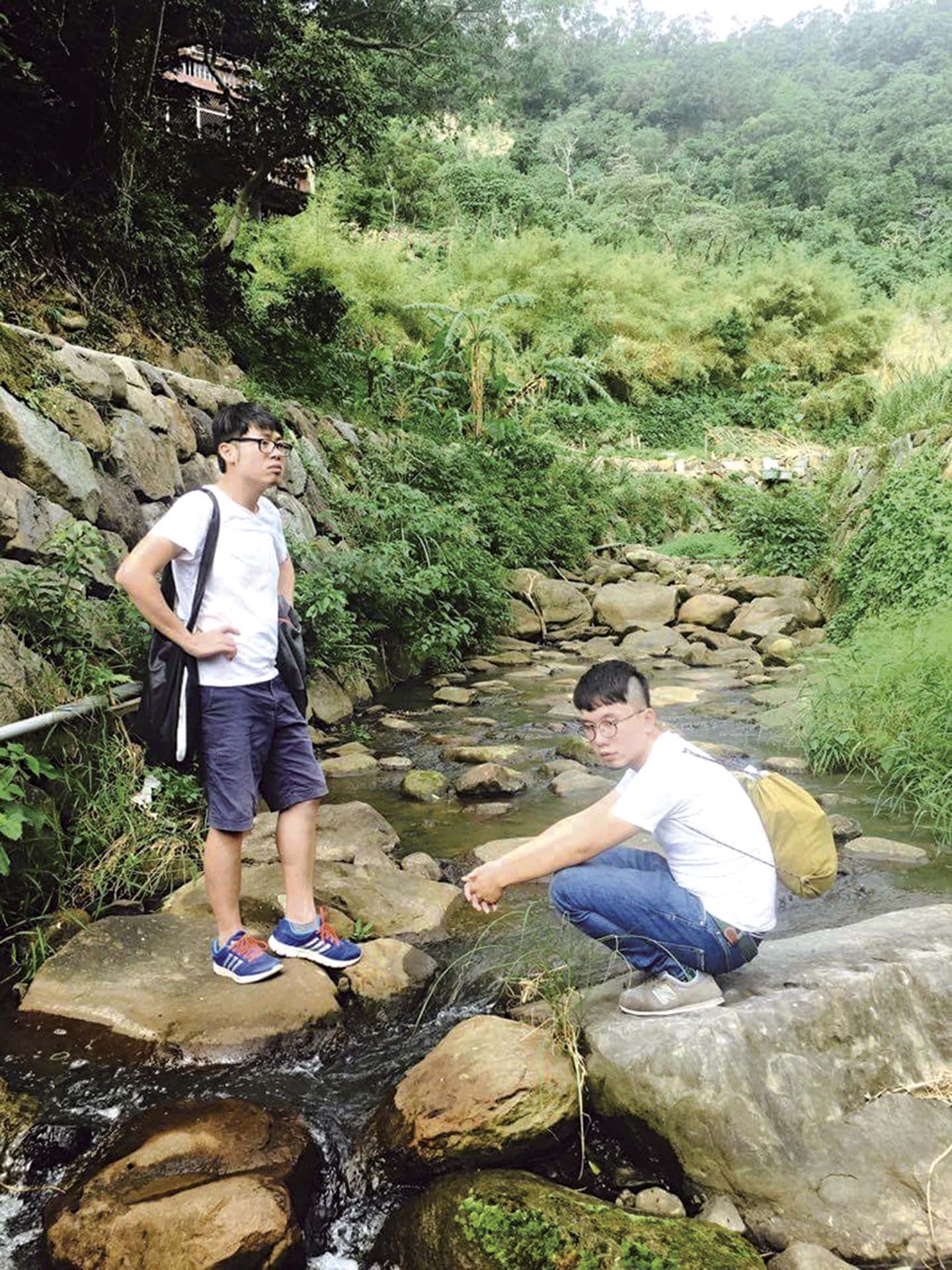 進駐竹圍工作室前,已經入秋,進駐後,很快迎來冬天,靠近淡水河,冬天的寒流格外考驗來自高雄的走路草。竹圍工作室提供給藝術家的房間坪數很大,除了偌大的草地與公共開放式廚房還有小小的菜圃,駐村期間,竹圍工作室安排了幾場活動,讓藝術家自由選擇參與,其中包含了樹梅坑溪的走讀。「就是傳說中的那條溪嗎!終於見到它了嗎!」抱著期待的心情,難掩興奮的與工作室的成員前往。「原來只是一條大水溝」的詫異和「終於看到真跡」的興奮,是參與導覽和走讀,第一次看到樹梅坑溪時,所產生的兩種真實心情,畢竟我想像中的溪流「太甲仙」,過於原野;從河口的鄭家古厝為起點,穿越民生路到馬偕醫院旁的小徑展開「溯溪」的旅程,綠意隨著步伐逐漸變多,沿途,從遇見刻有「鶴浦」與「皇清誥授」等字樣的墓冢開始,奇妙的歷史感與時空感便逐漸升起。當時的嚮導是李曉雯,由於曉雯曾參與過樹梅坑溪計劃,熟稔地穿越小農的田地、社區,沿著溪流古道,遇見道光年間的土地公廟及幾處紅磚三合院,直達上游的社區廟宇甚至是荒野,配合著現場的場景與導覽的解說,想像著過去這裡發生的種種。如今的溪水如此的平靜,與人們的日常如此貼近,一個上午的走讀,讓原本對於樹梅坑溪的朝聖感不再,但對走路草日後的創作,起了不同的作用。