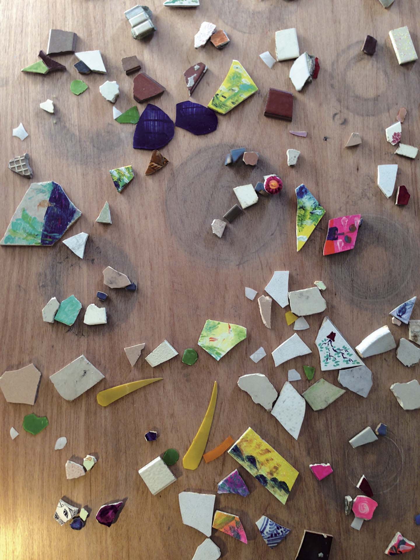 一個人的日常由許多細碎的例行性私事所組成,而竹圍的工作氛圍,則是讓例行性公事,變成他人可以參與的行政日常,這也是其他單位難以複製的特質與屬性。關於竹圍工作室的藝術家工作室開放,「例行性」與「公事感」的氛圍,並沒有這麼強烈,反而更像是自家Party的共襄盛舉,也因為如此,駐村期間各種不成熟的發想,也得以很放鬆的與他人分享,這些不正式的作品,在竹圍工作室發表後,就再也沒有機會拿出來分享,但如今回頭想起,當時的發想,對未來創作發展,埋下了育種的契機。該系列創作沒有具體作品名稱,我們僅以「事件一」、「事件二」、「事件三」作為思路上的區別。「事件一」是一幅隱含自己對故鄉小溪記憶的水墨畫,「事件二」是樹梅坑溪走讀過程中,所發現的建築磁磚殘片,我們沿路收集,轉化成一件動力裝置,瓷磚上則以指甲油繪出路上遇見的植物與景觀,而裝置平台上的殘片,則會以繞圈的方式,留下移動的痕跡。「事件三」是我們上下古道途中,互相拍攝的錄像,據說,該古道在近代,是在地居民上學的並經之路,因此我們沿著古道行走,講述著自己在藝術領域這條求學之路的故事,讓自身經驗與腳下的路程的歷史有所呼應。回看上述創作,現在的我們,之所以想返鄉辦理農閒藝術節,或是在作品中,加入農地裡的破片,並非天外飛來一筆的突發奇想。