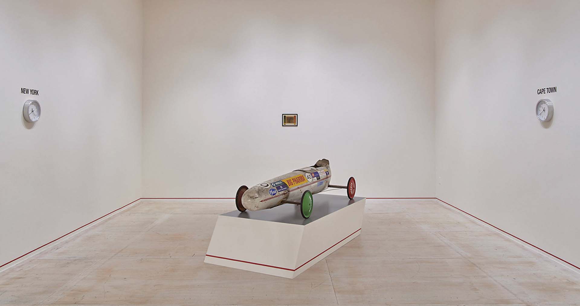 《駕駛》(Drive,2002/2019/2021)是走進展場後觀者遇到的第一件裝置,白淨的空間中停著一輛貼著各大藥廠標誌的跑車,跑車兩側牆面擺放著開普敦與紐約時區的時鐘,象徵著疫情散播途徑與區域醫療的競逐。以跑車作為隱喻,如果具有國際藥廠良好的支持,象徵愛滋病患者的車手得以在生存的跑道上保持絕佳的續航力。因此,全球的車手都試圖爭取最好的金援、設備、技術團隊,然事實是,絕大部分的選手無法獲得良好的支持,卻在半途中喪命。博多維茨在生存的競賽中顯然是具有優勢的一方,生在富裕的國家,擁有優良的醫療資源,諷刺地讓他成為藥廠成功營銷疊加的業績之一,從愛滋病患者搖身一變成為藥品消費者。