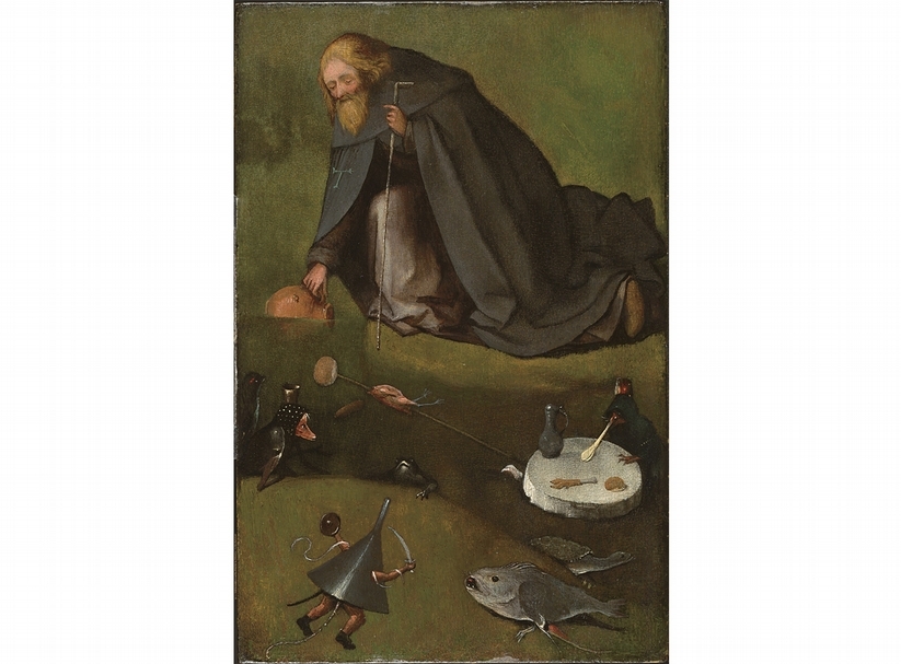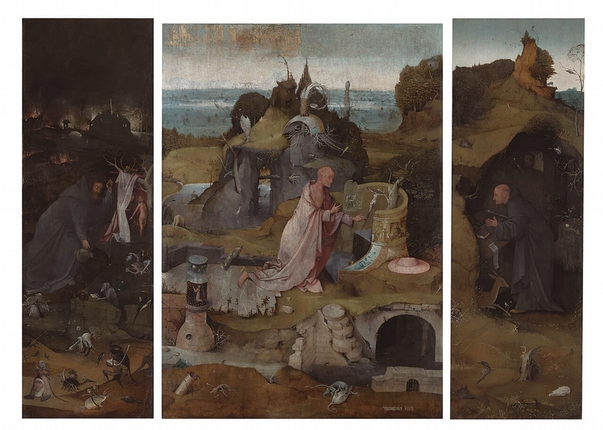 從美國借展而來的作品《聖安東尼的誘惑》(The Temptation of Saint Anthony),主要描述聖安東尼的行蹟故事。圖中他手持柱杖並跪在岸邊汲水,但前景部分卻出現一群奇異生物,包括烏龜、青蛙和魚鳥混成的不明物種。尤其一個具有四肢的漏斗形生物,正拿著刀盾張揚地四處跑竄,令觀者很難忽略其存在。也許這些魔物的現身,正是對主角聖徒的信心考驗與意志測試。另一幅《祈禱中的聖傑羅姆》(Saint Jerome at Prayer),則是體現聖傑羅姆的忠貞信仰。脫掉紅帽衣袍的聖傑羅姆,僅著白色薄衫跪趴在地,向著基督十字架祈禱。左側類似一頭小獅的走獸,則是依傍在一灘奇幻池塘邊,整幅畫充滿著神祕訊息。由於聖傑羅姆是波希命名的來源,所以兩者之間具有緊密關係。