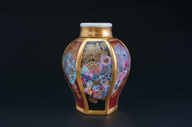 釉上彩又稱「瓷胎釉上畫琺瑯」,是一種用琺瑯色料於已淋透明釉高溫燒成的瓷器表面,進行彩繪裝飾後,再經多次相較低溫窯燒的一種技藝。而「染錦」是日文中,指以釉上彩(色繪)描繪並搭配部分青花(染付)圖案且互相結合的一種形式。