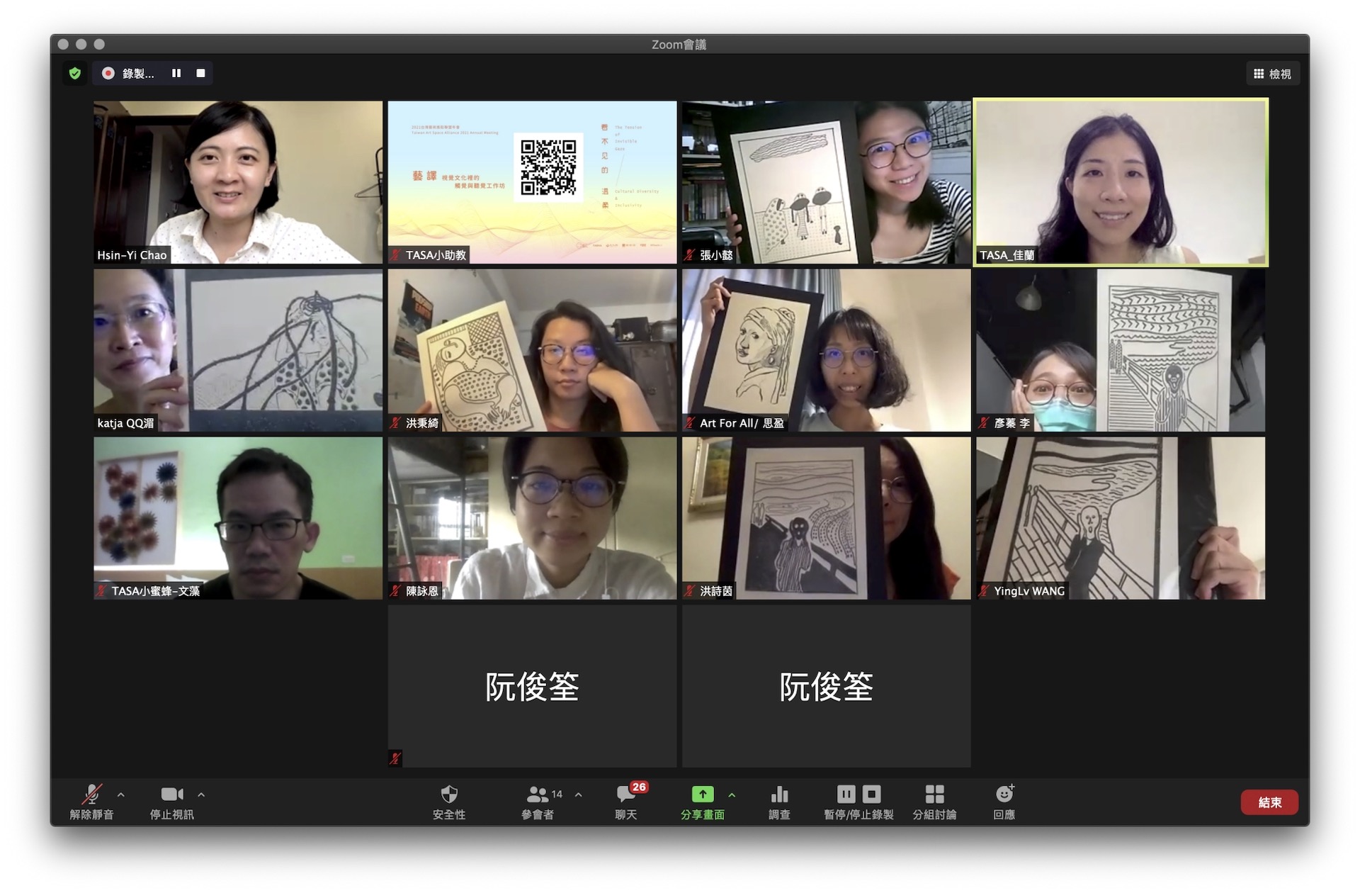 而今年工作坊舉辦期間因應疫情轉為線上舉辦,也更為考驗TASA的組織協調工作。不過,洪秉綺認為,線上工作坊相較實體活動在視覺與感官覺察的侷限,正扣合著本次年會的主軸。正如同在與視障者進行口述導覽時,並不是單向地傳達訊息即可,而需要反覆核對雙方的溝通是否成功傳遞與接收;而當線上工作坊無法透過網路攝影機,清楚閱覽教學間的操作細節與執行狀況時,同樣更加仰賴彼此透過互動對話。也就是說,「看不見的溫柔」的重點即在於帶領藝術行政放慢腳步,跳脫既有的認知與行事框架、體察自己的視角局限,進而溫柔地吸收參與者、障礙者的經驗反饋,並確認自己提供的服務或協作是否有效。