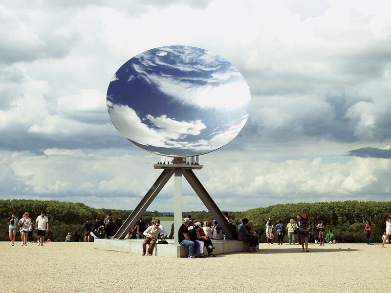 卡普爾《C-曲線》(C-Curve)、《天空之鏡》(Sky Mirror).2015。運用不鏽鋼拋光的手法的雕塑鏡是卡普爾的系列名作。藝術家將兩面鏡子放置花園入口反射大片花園,塑造出地上的「太陽」,與路易十四相互呼應。