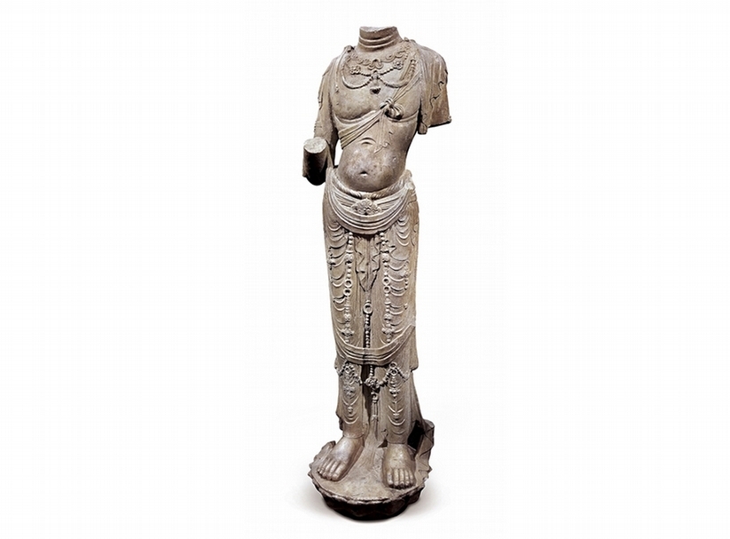 菩薩頭及雙手殘缺,頸刻三道,上身袒裸,佩項飾,斜披珞腋,身著貼體長裙,裙上掛滿瓔珞,跣足立於仰蓮臺上。菩薩身軀豐圓,重心放在右腿,身體曲線呈S形,體態婀娜,優美而飄逸。