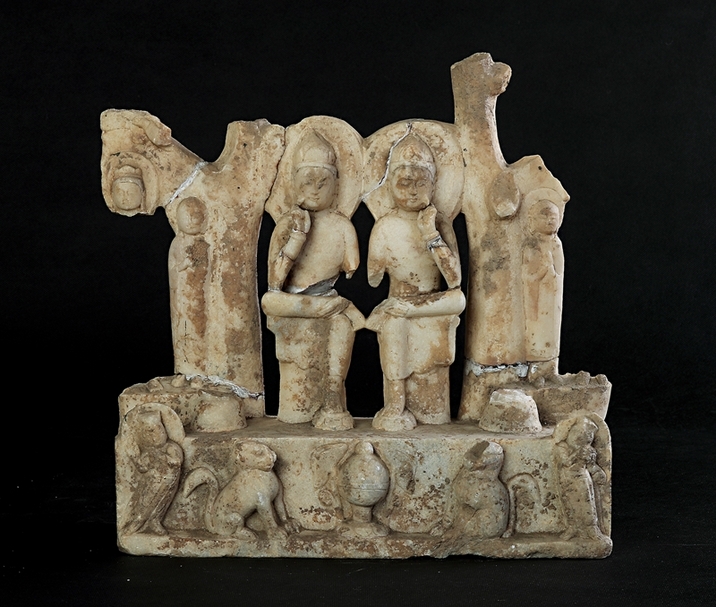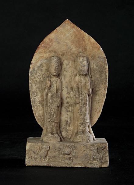 雙菩薩頭戴花蔓冠,腦後有圓形頭光,以手支頤,半跏而坐,腳踏蓮臺。兩側有合十而立的弟子,最外側的兩尊脇侍菩薩僅餘一頭像。雙樹背屏僅存樹幹。長方形基座正面雕雙力士、相對而坐的雙獅,正中央雕博山爐。
