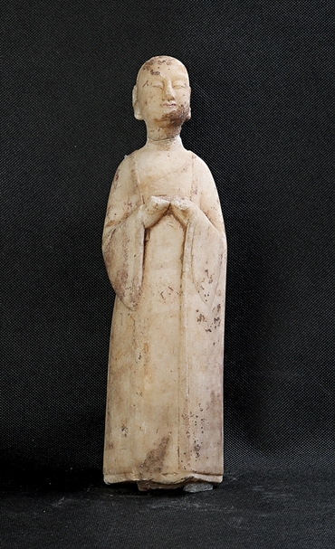 此像面容清秀,口唇塗朱,雙手殘缺,合於胸前,外披袈裟,內著僧衹支。衣飾簡潔貼體,流暢自然,袖部殘存彩繪痕跡。從其姿勢來看為羅漢立像,但亦有可能是比丘或弟子像。