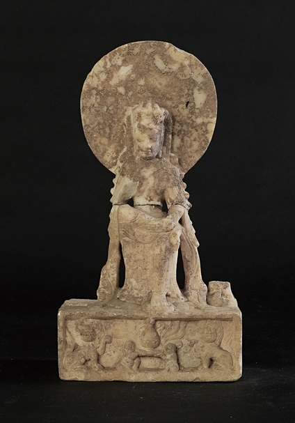 菩薩頭戴花蔓冠,後有圓形頭光,寶繒和頭髮自兩側下垂。帔帛自兩腋下飄垂至座。半跏趺坐,左手抱足踝,兩腿刻雙鉤陰線衣紋。兩側脇侍已佚失。長方形基座正面雕刻雙獅、二童子托博山香爐。