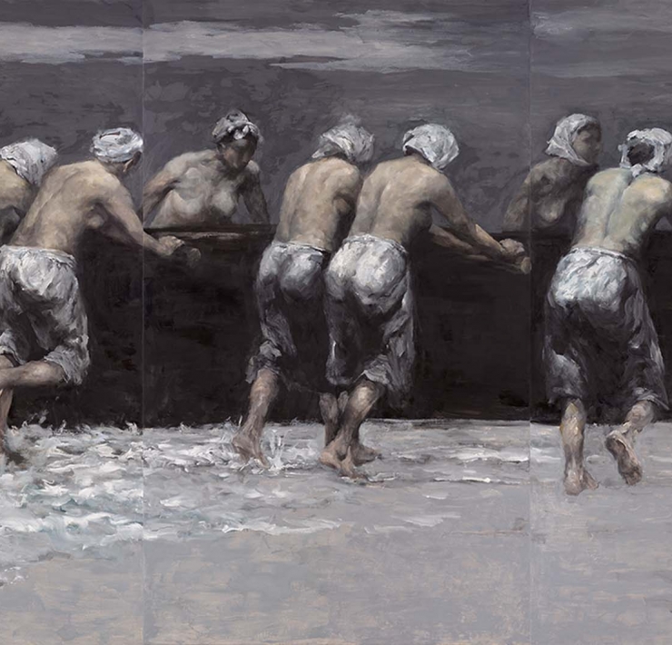 這幅作品透過八個人物來代表所有的老百姓,故事似乎是從右下方已經死去的中年人展開⋯⋯我們看到大眾的無助;老人失去了孩子,女人失去了丈夫,孩子失去了父親,面對突如其來的離別,他們哀痛不已,只能錯愕的叩問上蒼:「這是為什麼啊?」這是岑龍為2022年三月份即將在威尼斯蝸牛府(Palazzo Contarini del Bovolo)展開的一場學術展覽所精心繪製的第一幅巨作。《殤》讓我們再一次對「生命」進行了深思和反省,除了精神層次的高度外,為了呼應西方藝術史,畫面乍看以為是《哀悼耶穌》的內容,但卻是岑龍體驗到的獨特的人間煉獄。