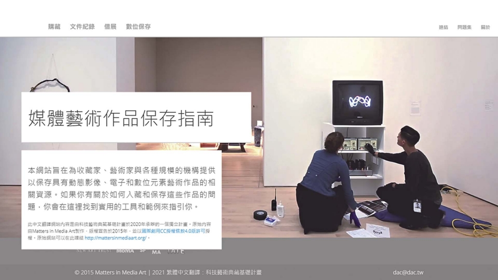 數位藝術保存對許多博物館來說並非是一個全新的領域,從攝影更迭到膠卷、磁帶、光碟片……,其媒材的發展脈絡是有跡可循的。歐美國家正是在類比技術更迭至數位的這段時間,投入越來越多的研究在影音、數位文化資產的保存。一方面受到市場技術代換速度加劇的威脅,另一方面也在幾所代表性館所彼此借展的情境中,意識到建立共識的重要,最早成立的跨國媒體藝術保存事務計畫就是在借展的背景下所組成的。2005年舊金山現代藝術博物館(San Francisco Museum of Modern Art,以下簡稱SFMoMA)、紐約現代藝術博物館(Museum of Modern Art,以下簡稱MoMA)和英國泰德美術館(Tate Britain,以下簡稱Tate)在新藝術信託(New Art Trust)的贊助下,組成「媒體藝術事務」(Matters in Media Art)計畫,(註1)自此奠定了這個領域的基礎指南。爾後,MoMA、Tate再加上美國紐約古根漢美術館(Guggenheim Museum,以下簡稱古根漢),普遍被專業社群認定為這個領域的楷模,自然也成為各地美術館的參照對象。