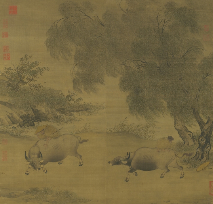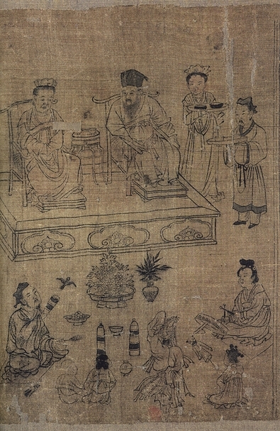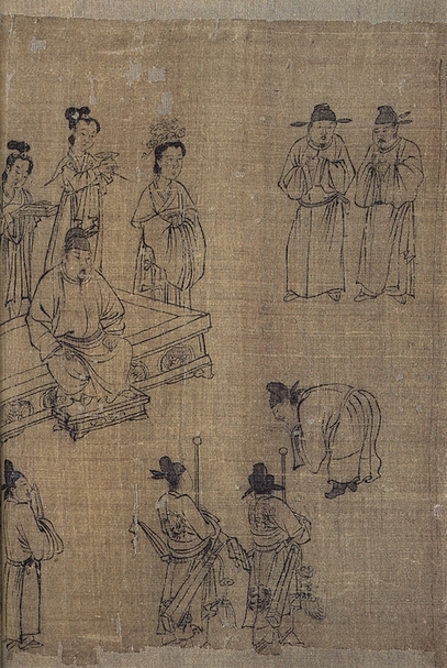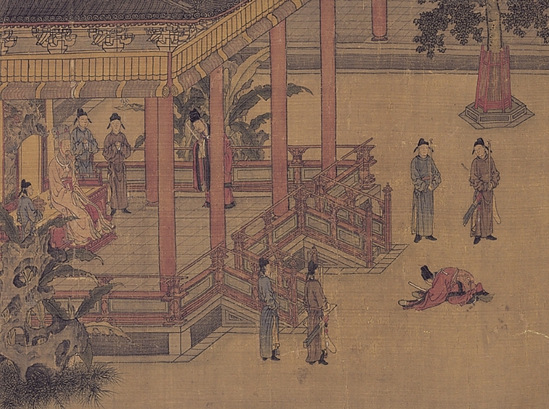 只見畫面中央有一名鞠躬而立的臣子,正不卑不亢地向皇帝進諫;其面前的天子則面露不悅,雙手緊壓於膝上嚴肅端坐,似乎隨時有勃然大怒、拂袖而起之可能,更別提皇帝身旁還站著一位垮著臉、令人望而生畏的皇后。如此之場景和凝結的氣氛,遂使一旁的兩位士大夫開始焦躁不安地竊竊私語起來。在崇尚文治的宋朝,皇帝雖享有絕對權威,但在儒家體制所建立起的官僚體系中,其權力還是受到某種約束,如御史臺諫官便有權力監督皇帝,唯其職能是否能充分運作,在很大程度上仍端賴著進諫者的勇氣和良心,畢竟此乃性命交關之事,在孔教倫理和現實世界之間還是得取得某種平衡。
