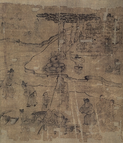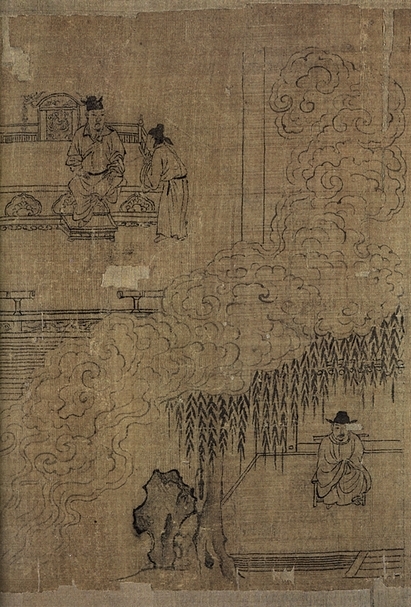 一般宮廷職業畫家在描繪「事君章第十七」這段內容時,可能會畫出臣子向皇帝曲躬行禮、表現其一片忠誠的場景(圖7),但李公麟卻在畫面上大膽地利用一團雲霧,將整個畫面分為對角兩半(圖8):雲左上方的一半,表現出一位士大夫正向君主諫言,而雲右上方的一半,則見同一位士大夫隱居於私人居所,想著該如何彌補自己的錯失。也就是說,畫中同時呈現了士大夫面臨「事君」與「退隱」之間的抉擇時,其內心的衝突與煎熬。李公麟雖在朝為官,身處於新、舊黨爭不斷的北宋,卻是一位具有林泉之志和隱逸思想的文人,正如同其老友蘇東坡所云:「伯時有道真吏隱,飲啄不羨山梁雌。丹青弄筆聊爾耳,意在萬里誰知之。」或許正因如此,才能讓李公麟一生未陷入任何紛爭或遭致貶謫。而此幅「事君章第十七」,實足為其仕途生活之箴言。
