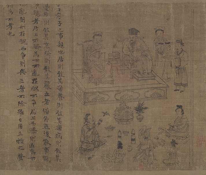 這部著作乃是以孔子及其門徒曾子對話的形式,談論孝道和以孝治理天下之法則,以供後世楷模。姑不論自宋代開始即不斷有學者質疑此書並非孔子所撰述,而應出自後人附會,但當時的儒者仍是對這部經典寄予厚望,盼藉之能振興儒家倫理,遂將其正式列為「十三經」之一,成為新儒學的重要經典。而此書的精神主旨和內涵,也在宋代首席人物畫家李公麟的妙筆生花下得到絕妙的體現,成為流傳至今仍被奉為不朽的繪畫藝術傑作——〈孝經圖〉卷。