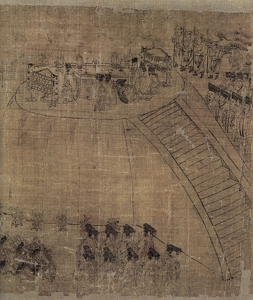 簡言之,本章中不僅提起盡孝的差序格局,也談到了祭祖在孝道中至關重要的地位,更明示出全國性祭祖之最高禮節,莫過於皇帝以天子的身分舉行祭天的儀式。有鑑於此,李公麟在「聖治章第九」這段圖畫中(圖5)先畫出一段長長的階梯,待拾級而上便能通往頂端的一座露天祭壇。只見祭台中央擺著一塊用來祭天的玉璧,祭壇上方有形似星座的符號標記,乃代表諸多天神,至於環繞著祭台及祭壇之底部,則可見油燈熾烈燃燒著。人間至高尊位身分的天子與首席司儀官,便跪在此神聖的祭台前,於鐘、磬等樂器之伴奏下,準備與天帝和祖靈溝通,好讓自己的統治權力與天命相互連結,賦予帝國生生不息的生命。在此,李公麟巧妙地利用金字塔形的構圖,將祭天場景置於畫面頂端,並利用人物的位置與活動來暗示帝國運作中君尊、臣卑關係之次序,使得〈孝經圖〉既是一幅詮釋儒家經典的圖像,亦為理想聖君所轄帝國形象之完美呈現。
