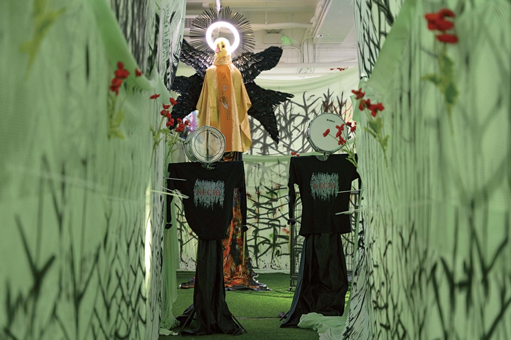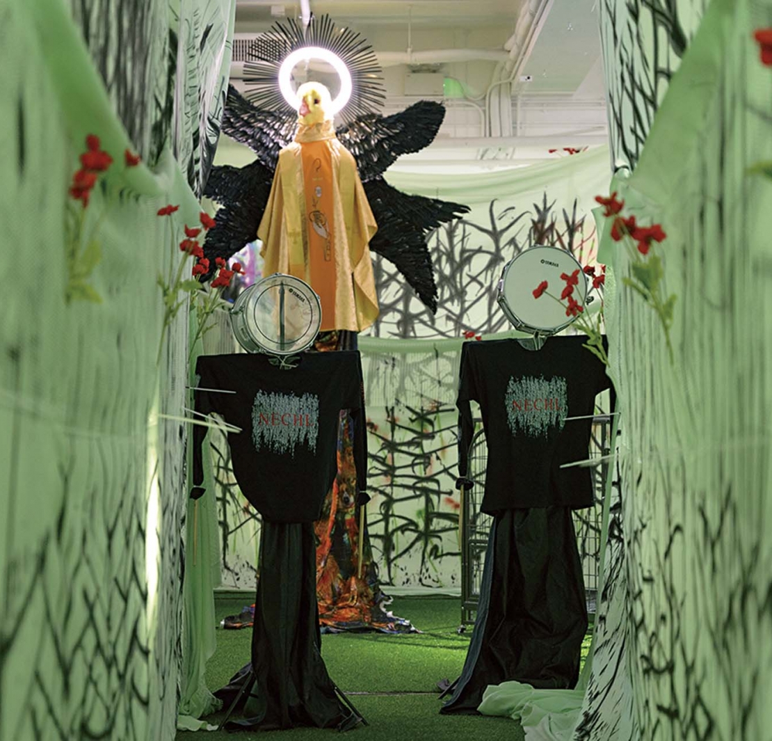 甫進入畫廊的空間,藝術家已經為展覽定調,將現實轉變昇華為幻境,建構遊戲和儀式感般的現場:除了入口通道中散落一地的黑色羽毛外,又留意到他在籠罩通道的淡綠色醫用窗簾上用直接從墨水瓶噴射出的墨水繪畫的樹木,創造出圖像重複的樹林背景,模擬實境角色扮演遊戲的設置與環境;沿途又會見到一系列他用簡易設計效果製作的畫作,畫作上既有一種廉價的稚嫩感,當中隱藏「阿里巴巴」、「淘寶」等中國大型企業的字樣,勾起了觀眾對於資本主義集團的想像和批判,雖然作品未見深刻,但配合畫廊的環境,頗有一種穿梭於遊戲世界和異度空間的虛擬實境之感。