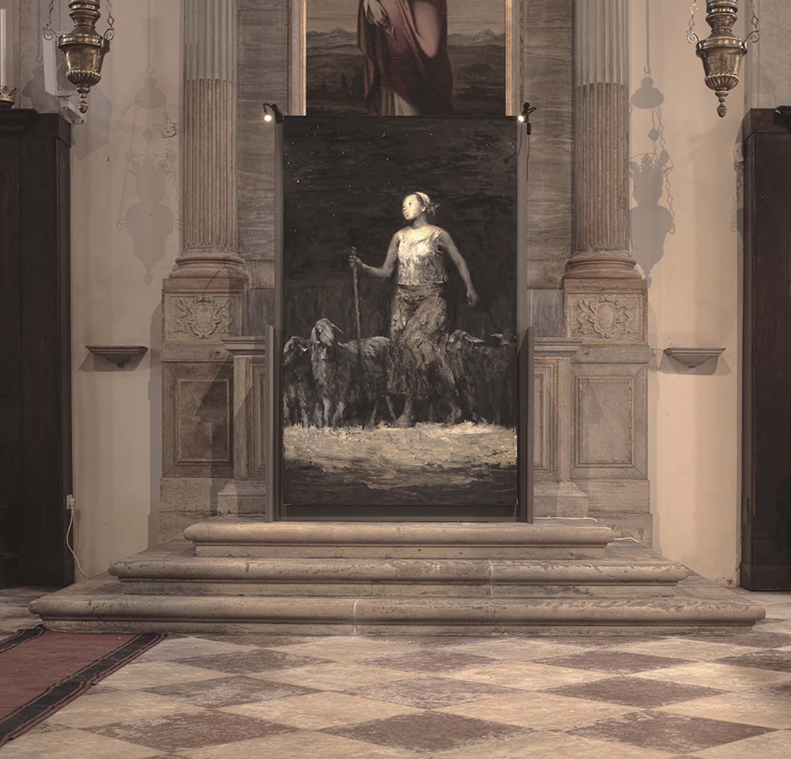 記得2019年於威尼斯馬爾他聖若望教堂所策劃展覽「蒼穹星光—岑龍和他的藝術」,其重要作品之一《蒼穹星光》(2019)裡閃亮的星光眷顧著辛勤的牧羊女,在暗夜中照亮回家的道路。抬頭仰望星空的少女感受到上蒼對她的憐愛,因而無懼大自然艱困的考驗,這就是堅定的信仰對於人性所產生的巨大影響力。岑龍為畫面營造了無所不在的光,隱藏了慈悲善良的造物者,這裡有一條通往上天、肉眼看不到的通道。