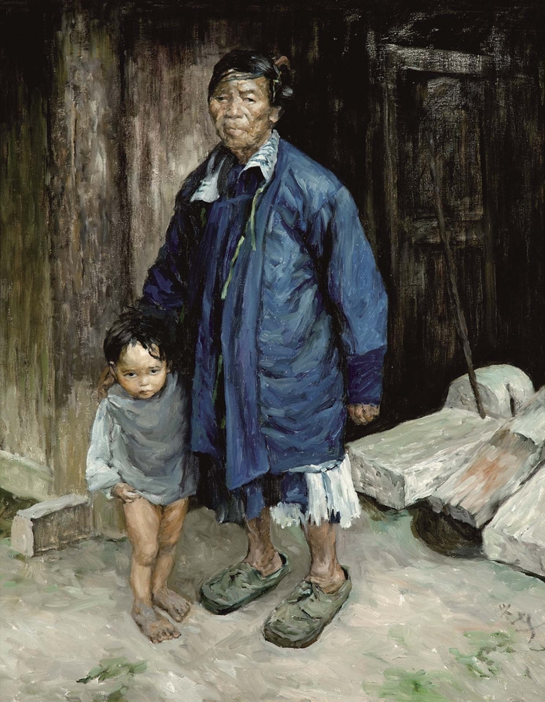這樣的惺惺相惜,彷彿是冥冥之中的安排,吳世敦回憶往事說,2012年台南藝術博覽會,他在涵藝術的展位受到畫廊藝術總監林暄涵熱情招呼,除了介紹展場作品之外,還出示岑龍畫冊,當時他深受岑龍作品的氛圍感動,特別看上《苗家祖孫》,該作描述親情的作品,拙樸親切。滿臉愁容的滄桑老奶奶,怯生生小男孩依偎在她身邊,擁有一雙大腳的奶奶,像是踩踏土地的穩定力量,讓小男孩依偎在老奶奶的衣擺間,祈求一份安全與安定。岑龍借景傷情,是他失怙童年的心情故事。