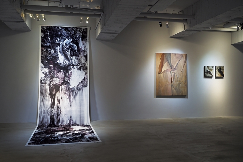 展場一隅,右為克魯斯(Marina Cruz)《呼吸的圖樣》一作,左為伊斯塔柯(Patricia Eustaquio)以數位印刷與天鵝絨材質完成的作品《初生之石》。(安卓藝術提供)