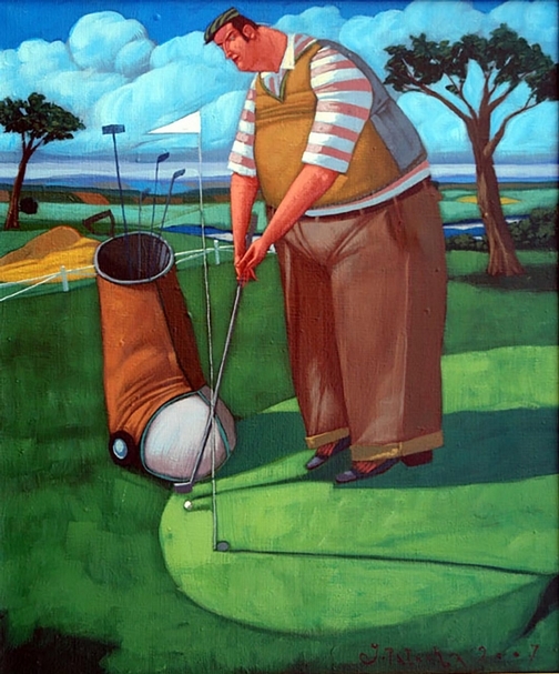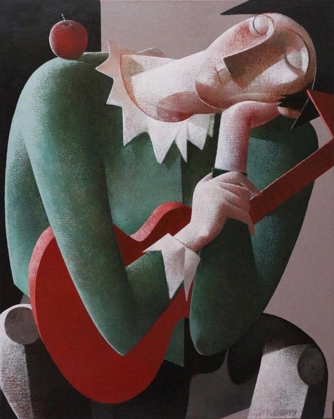 彼得.哈斯肯波(Peter H. Harskamp),《Clown with Guitar and Apple》,油畫,100x80cm,2017。(台北新藝術博覽會提供)