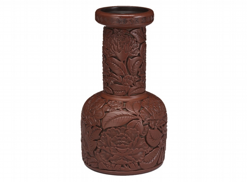 色澤醇厚、手感溫潤的漆器,具輕巧、防潮、隔熱等特性,唯製作費時費工,尤其雕漆作品從製作到完工更須經過製胎、髹漆、雕飾、研磨等上百道工序。明代永樂朝始於京師設「果園廠」專製御用漆器,成品精美絕倫,尤以剔紅最具代表性。〈朱漆剔紅花卉長頸瓶〉器形端莊大方,滿飾布局嚴謹的多種花卉紋,花瓣層疊錯落,葉片舒展有致,枝幹婉轉相連,足見刀法自如。瓶底針刻「大明永樂年製」款,開皇家專造漆器製款之先河。