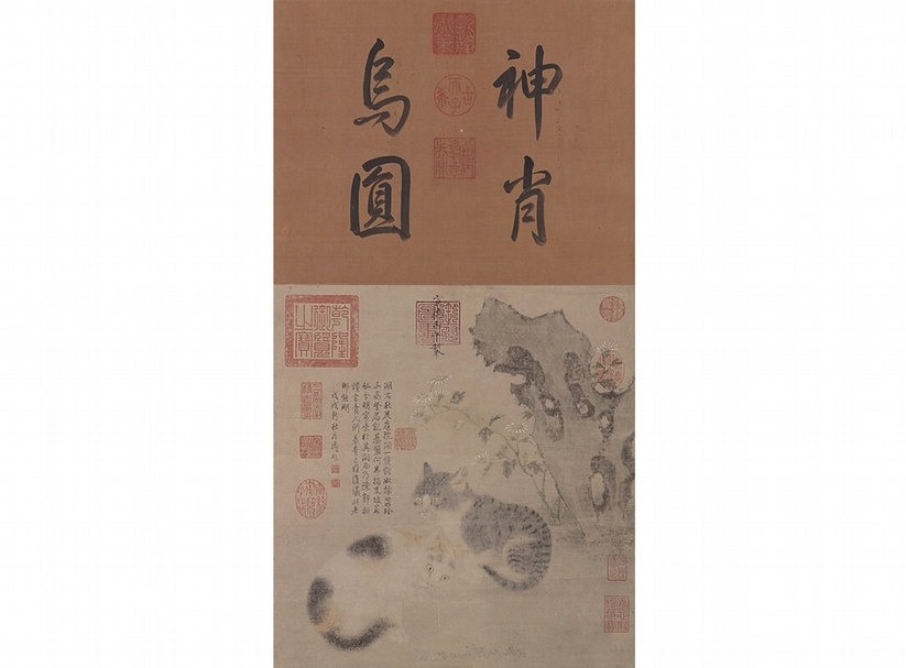 明宣德朝宣宗朱瞻基繪〈花下貍奴圖軸〉,紙本設色,故畫000421。台北國立故宮博物院版權所有。