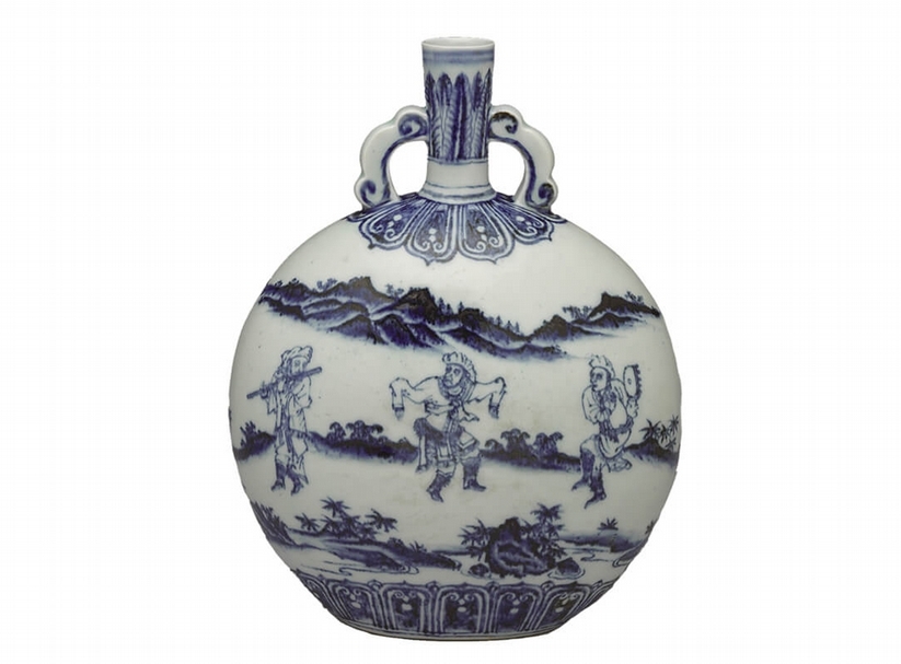 青花瓷是以鈷料描繪紋樣,經施罩透明釉後高溫燒成。〈青花西域舞樂人物紋扁壺〉即為永樂、宣德御窯青花中頗具代表性之作例。一方面,此器青花發色濃豔,圖案具水墨暈散效果,並帶滲青鐵鏽斑點,呈色有別於此前洪武時期的灰藍,或稍後成化時期的清朗色調,風格獨特鮮明;另一方面,此般器腹圓扁之扁壺造型,其主紋於中國傳統山水園景描繪外,又添加奏樂歌舞的五名外邦人物,俱為受伊斯蘭文化影響之新元素。這些既說明當時中西文化、貿易交流之密切關係,又反映景德鎮御窯廠因時創新的製作能力。