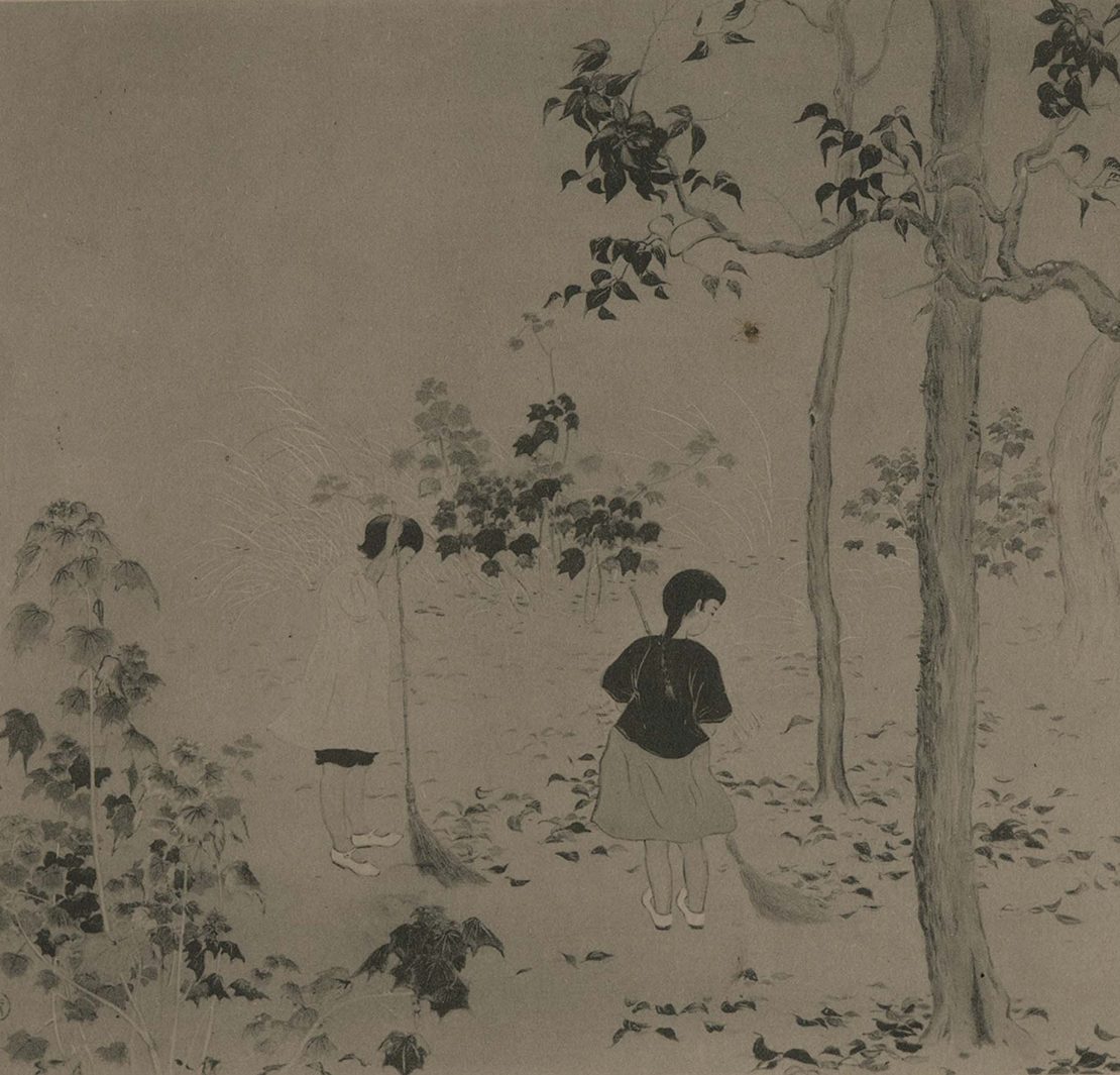 或許因這樣的經歷,吳梅嶺在臺展時期的作品有如刺繡般,在整體構圖下以精密的筆觸繪製細部。如1930年入選第四回臺展的作品《新岩路》即展現其精細的工筆畫藝。畫面上不僅可見壯闊的山勢起伏,在細微處樹林間的每棵樹木也躍然紙上。1932年入選第六回臺展的《靜秋》在構圖上以庭園景致與人物姿態建構庭園的空間感外,當中樹幹細緻的紋路彷彿就像刺繡絲線構成。翌年,第七回臺展入選作品《秋》,更是以細膩工筆描繪花草藤蔓的諸多姿態,甚至是枯萎向日葵葉上的細微紋路都一一呈現。最初,繪製刺繡底圖是吳梅嶺補貼家用所接的副業,然這項副業也奠定了他繪畫風格的基石。