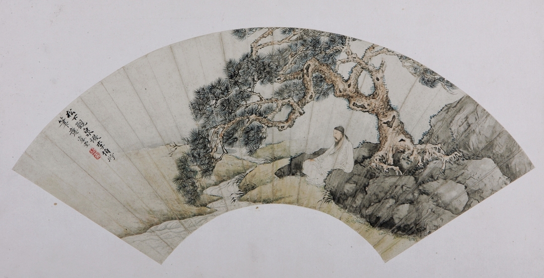 蔡嘉(1686-1779後),字松原,一字岑州,號雪堂,一號旅亭,又號朱方老民,倪璨曾言其出身:「嘉幼習銀工,不屑就,棄而學畫。年未三十,即得名。」本幅筆法秀勁,設色雅致。畫家描繪高士倚石而坐,在松蔭下沉思。畫中古松盤屈虯勁,山石間的清泉潺潺而流,彷彿遠離了世俗塵囂,如入無人之境,呼應著畫中高士高風亮節的隱逸心志。