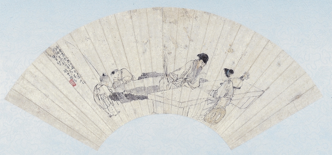 黃慎(1687-約1772),初名盛,字恭壽、恭懋,號癭瓢子,東海布衣等,為揚州八怪之一。他自幼賣畫,離開家鄉福建至揚州打拚,闖出一番名聲。他擅長各類繪畫,其中人物畫受到大眾青睞,鄭燮曾贈詩予他,「愛看古廟破苔痕,慣寫荒崖亂樹根;畫到情神飄沒處,更無真相有真魂。」本次展出的《弈棋圖》扇頁是畫家43歲時所作,取自唐代詩人杜甫的〈江村〉詩意,畫幅右側的詩人正聚精會神、專注地與妻子對弈;另一側是兩位面容稚氣、綁著小辮的孩童,其中一人手持魚竿,另一人在敲製魚鉤。人物相處怡然自得,展現趣味妙生的雅士情調。