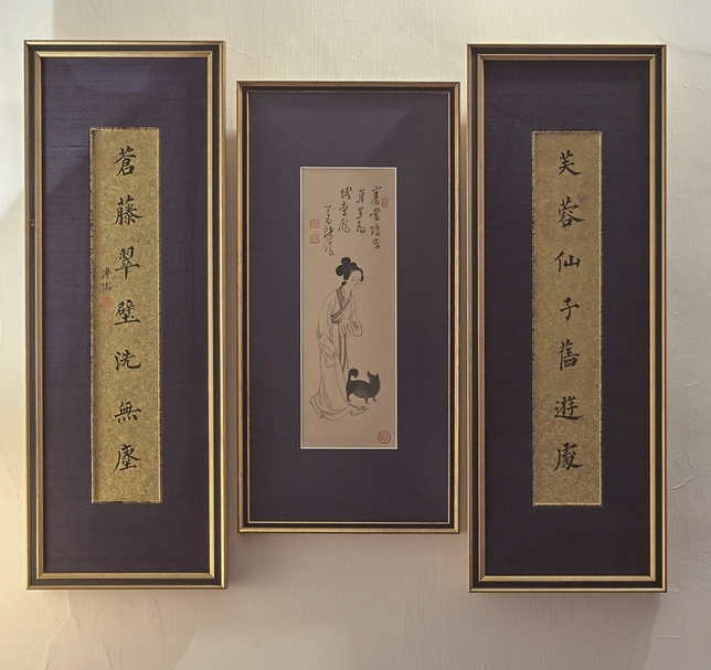 溥儒〈楷書七言聯〉,水墨金箋;溥儒〈美人黑犬〉,水墨絹本。圖︱香港蘇富比