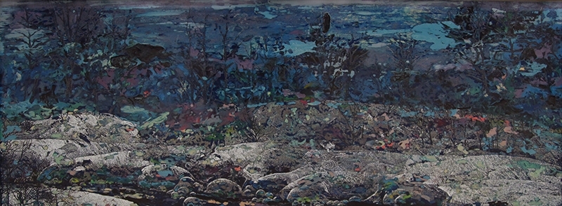 李英偉的畫作,總給人一處幽然靜謐之息。山裡人家、濕地、樹木沼澤,所繪上的每一個平凡、不起眼角落,卻次次啟發觀者,放大回憶任何一絲絲的生長態勢。絢麗的細膩技法與獨特色調,是他表達藝術家個人對社會與環境的看法還有對自身的回憶。他的視覺衝擊力是層次分明且精緻的,表現了自然境態中的時間與醇厚。而此次參展新作“等待後花園”指向生態失衡後的生機重現。厚德載物,自然之力總是不可抗拒的頑強的修復由於人類不斷地破壞的瘡痍…畫面以綠色為主調彰顯生態,生靈,生命的堅毅和不可撼動的尊嚴。