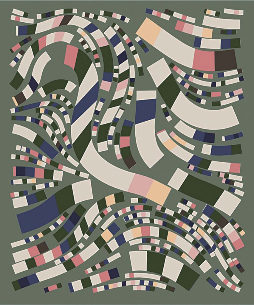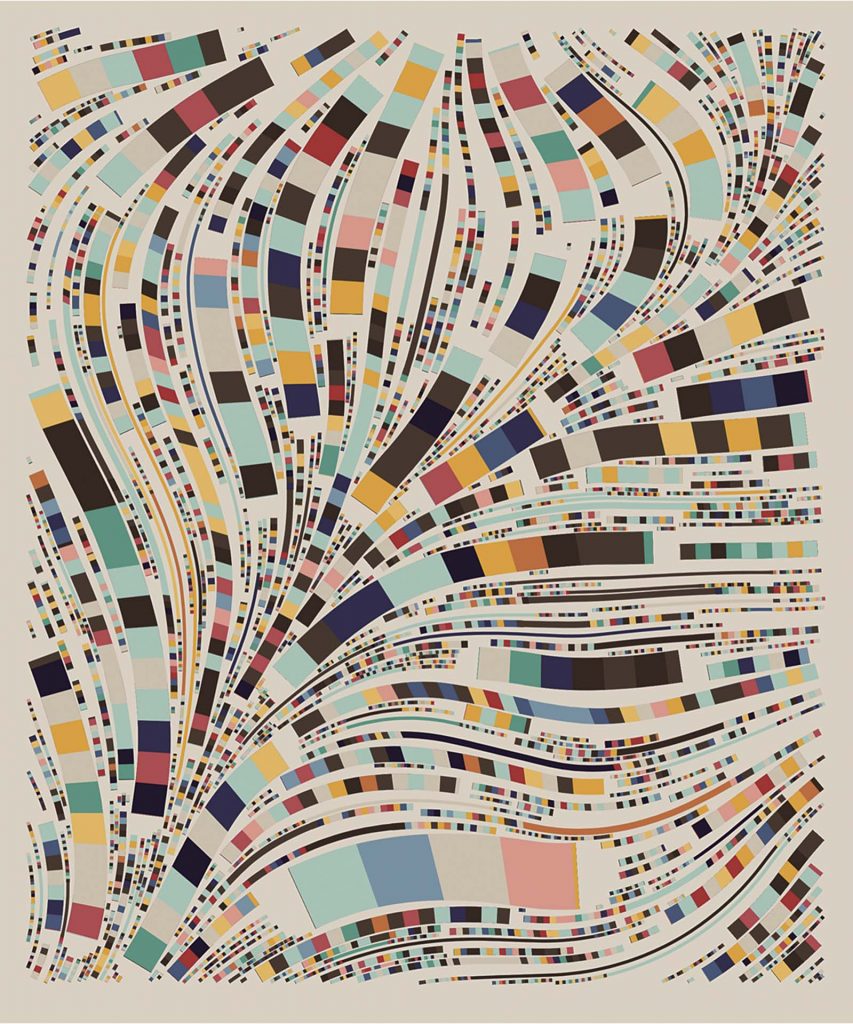 而在Art Blocks第三、第四高價,則是同樣深受歡迎,藝術家泰勒.霍布斯(Tyler Hobbs)的「Fidenza」系列。該系列甚至因為出現未經藝術家同意便使用其生成代碼的山寨版而在社群平台上引發激烈討論,因為用於衍生藝術的代碼便可說是「藝術」本身,一如其生成的作品。簡單看來,「Fidenza」便是曲線與色塊的組合,其核心演算法的主要基礎是流場(flow field),也就是流體運動所佔據的空間。也因此,若我們僅看其基本線條,不難有全球天文氣象圖的感受。霍布斯對線條設定了不會或會碰撞和重疊、不同概率的顏色分配,尺度、大小元素、鋒利或圓滑的邊緣等種種設定,創造出各具特色衍生結果。霍布斯於個人網站中表示,「Fidenza」並非太複雜的結構,但其演算法的核心結構非常靈活,於是允許足夠的多樣性來不斷產生令人驚訝的結果。其真正艱鉅的挑戰在於:如何在不可預測性和品質之間取得適當的平衡。