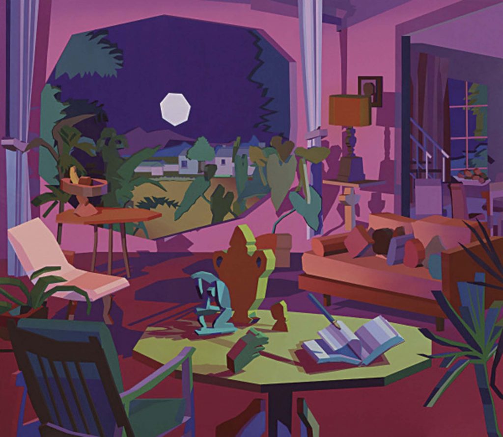 過去兩年,同樣是1987年出生,來自美國布魯克林的藝術家喬納森.查普林(Jonathan Chapline),同樣以其數位虛擬化美學在藝術圈大放異彩。帶有電腦螢幕冷調螢光感的大量洋紅與靛藍,是其作品令人無法忽略的特質。他的創作首先會挑選一些形式感較強的室內影像,然而使用3D程序來構建圖像,最後再列印到畫布上,形成色彩飽和、風格鮮明的室內場景。我們不難在他的作品中歸納出電腦生成、建模、多維空間、數位光源佈局、圖層、漸層色……,諸多視窗內產生的視覺樣貌。並藉由桌面靜物,人體群像,經典的文學題材等元素,串連觀者與畫面的共鳴。對查普林而言:「我對實體與數位之間的連結以及它們可以如何融合很感興趣;我認為它們是兩個分開的過程,而我可以在其中自由來去。」