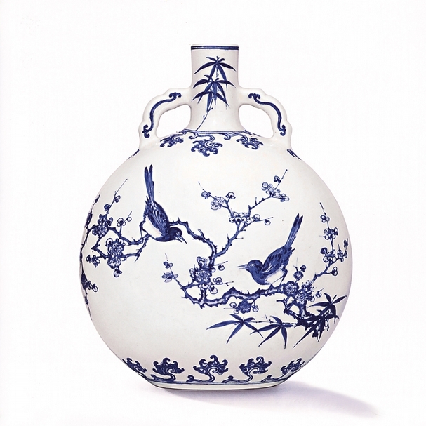 此瓶小口、直頸,頸兩邊具如意形耳,扁圓腹,橢圓形圈足。全器以鈷藍加以繪飾,頸繪竹葉紋,肩部及脛部繪飾對應的五出葉紋,雙耳各飾靈芝紋,器身一面繪兩鵲鴝於梅樹枝上相對唱和,梅樹下生有一叢竹子,另一面則繪一對白頭鳥棲息於杏花樹上,其中一鳥回望其同伴。器底寫有「大清雍正年製」篆書青花款。青花發色清麗,畫工細膩,體現自宋朝以降的中國花鳥畫的傳統。自1950年代起入藏倫敦私人收藏並於家族間流傳至今。