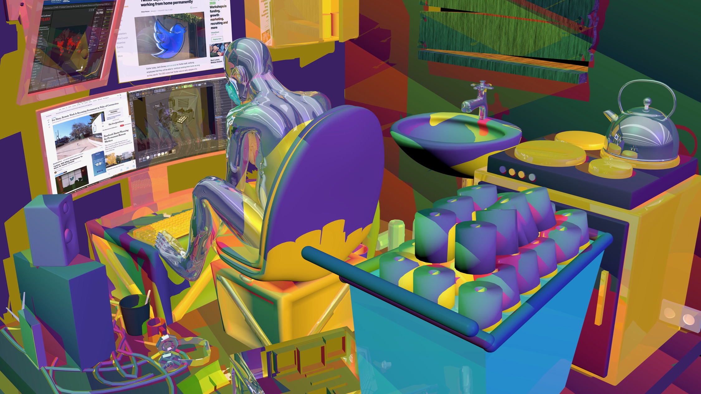 2020年突如其來的疫情,讓所有人事物都暫停了下來,經過各國強制性的封城防疫措施,原先必須得要實體參與的日常生活,被迫在一夕間都轉移至線上網際網路的世界進行,使人們短暫快速的建構那些原先被視為電玩、虛擬的世界,在這個無國界的世界中帶入日常生活。當近乎所有事物都改為發生在網路的虛擬世界上時,藝術當然也不例外,其中數位藝術更是扮演要角,以其數位原生的優勢參與,拓展至各個領域。