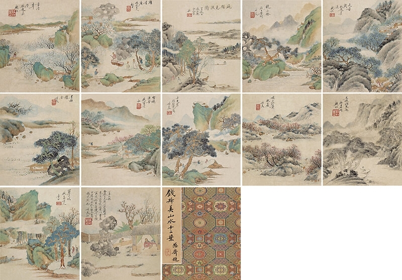 錢杜於丁丑年(1817)為金元鈺作〈臥遊圖冊〉12開冊頁,設色紙本。曾為2014年朵雲軒春拍拍品。
