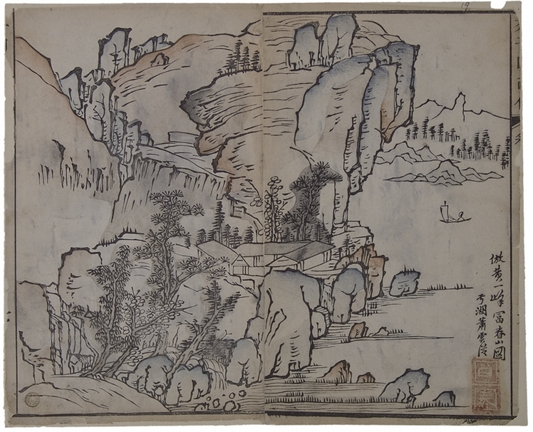 繼《顧氏畫譜》之後,清初《芥子園畫傳》同樣引人注目。《芥子園畫傳》,又名《芥子園畫譜》,康熙年間由沈心友主持,請畫家王概創作,其他協助畫家有王蓍、王臬及諸升等人(圖7)。清初著名文士、同時是主持者沈心友岳父的李漁極力支持,讓這套畫譜在自家園林「芥子園」刻印之外,也親自為這套畫譜撰序。《芥子園畫譜》品質精良,初版用時下最好的開化紙套色製作。《芥子園畫傳》內容為各家風格繪畫的範本,評價兩極,然而細觀插圖的線條刻劃流暢、部分更使用棕、藍、綠、黃、紅套色,色彩清雅秀麗,不失為學畫入門的優良教材(圖8)。清代松年在《頤園論畫》肯定它對學習者的示範作用:「近所傳之芥子園畫譜,議論確當無疵。初學足可矜式。先將根腳打好,起蓋樓台,自然堅實。根腳不固,雖雕梁畫棟,亦是虛架強撐,終防傾倒。」