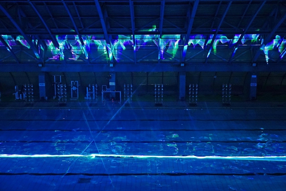 於是,和過去兩年的「關渡光藝術節」來對照比較:2016年以11件裝置性展出,著重在地景式和光藝術;2017年則是同時有裝置展出,也有表演式的演出;而今年,則合成為一場名為《游泳克》的大秀。而2017年的表演,則仍較為局部和陽春,除了和音樂表演串在一起,受限於資源分散,列為「特別演出」的《光芒》(Rays of Sonic Light)可能讓人聯想到的是「失聲祭」或「超響」。但無論如何,就去年的《光芒》最初規劃和移師到的雨備地點游泳館,出現了另類的好效果,也能解釋為何今年的「關渡光藝術節」是《游泳克》。