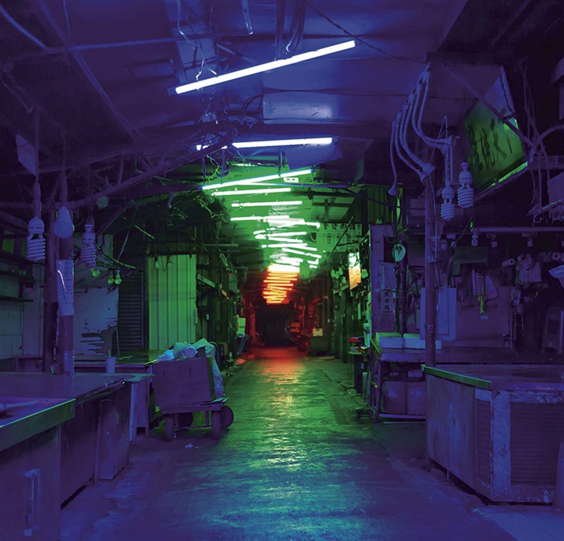「台北機電人2.0」兩個現場各自獨立,又具備或明或暗的連結。立方計劃空間的白盒子內由有機物、無機物的各種組裝體、象徵資訊網路的螢幕,談論的是疫情之中人的溝通方式;龍泉市場所設置的沉浸式場域則訴諸疫情之中人的感官經驗,充滿濃郁王家衛電影氛圍的聲音(藝術家撰寫並預錄的一則故事)與光(RGB彩色光源)貫穿其中,而與LFP香料香水實驗室合作的氣味裝置既連結著前一場域中不斷更新的網路垃圾資訊,也以原本並不屬於市場的一些氣味,指涉並重塑著這個交疊著記憶與關係的場所。