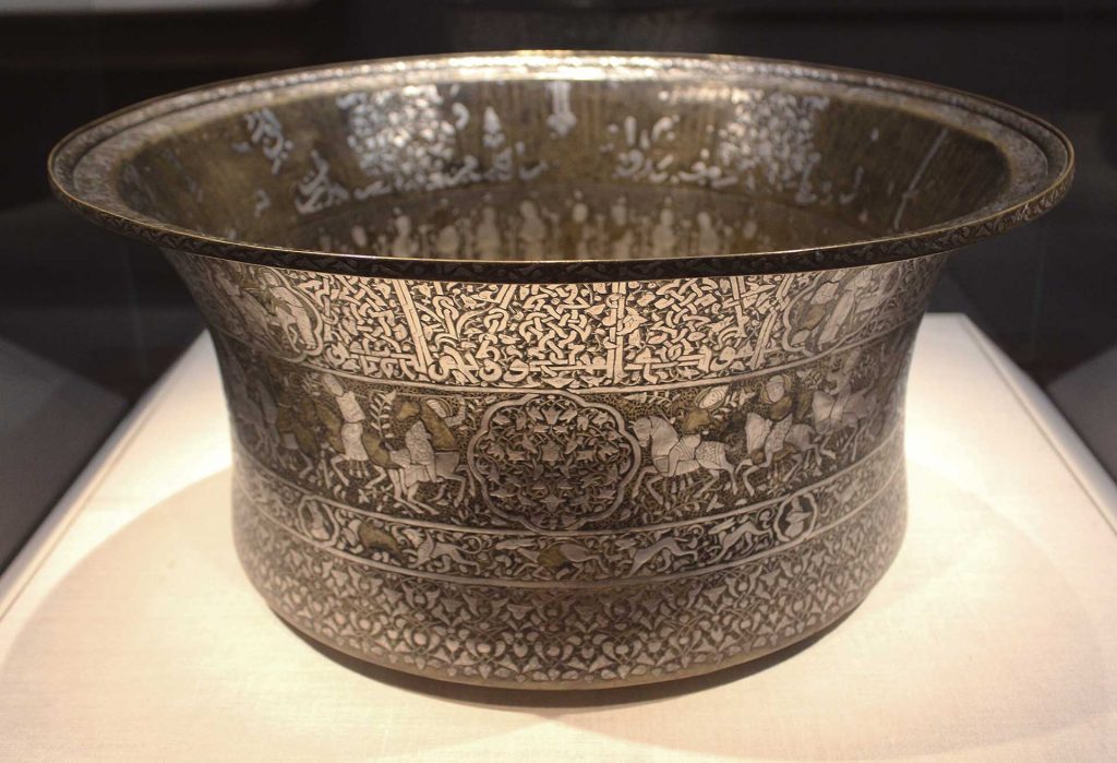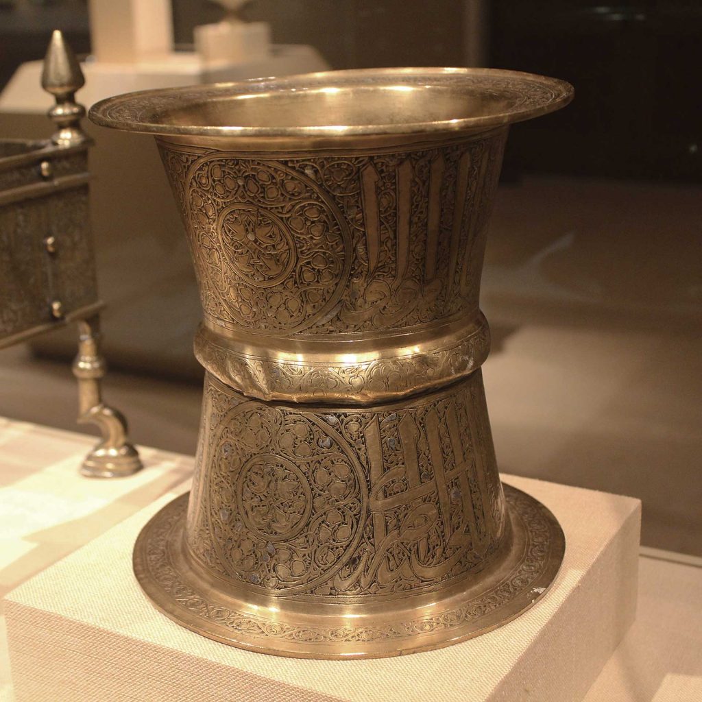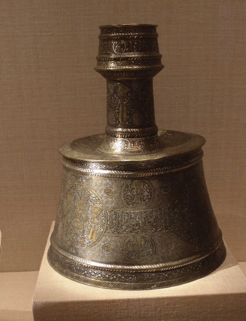 還有一類燭臺,透過器型的對照,也能看到兩者之間的聯繫。這類黃銅製品工藝技術的核心地點有四個,分別是呼羅珊地區的赫拉特,還有摩蘇爾(Mosul)、大馬士革(Damascus)和開羅(Cairo)。存世的絕大部分嵌銀黃銅器物,幾乎都和這些地方的王朝及精英階層有關。