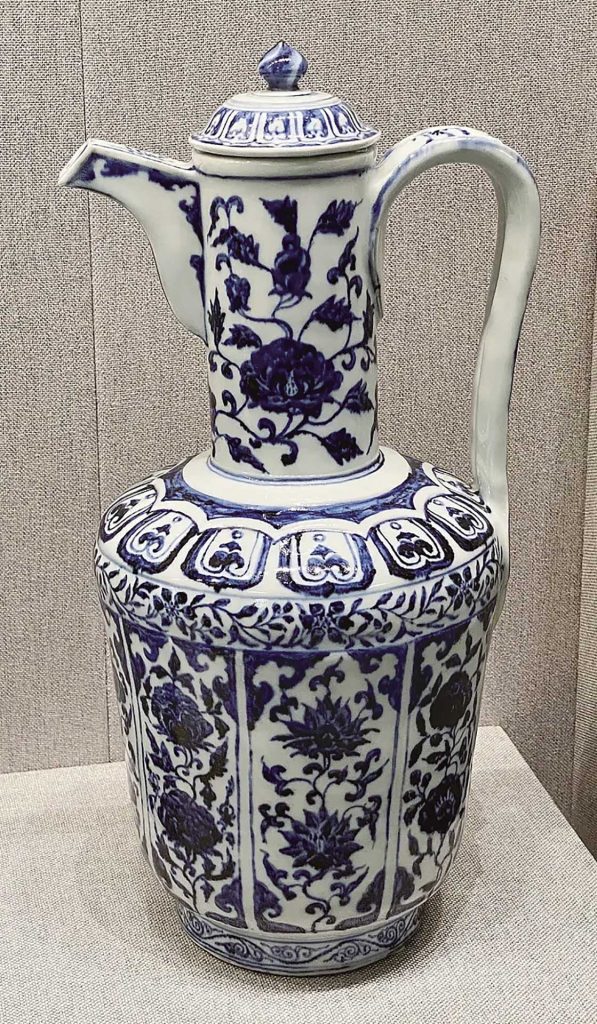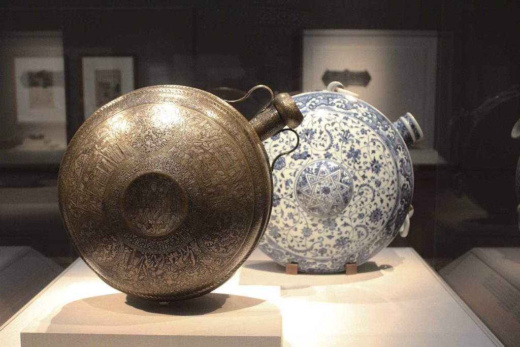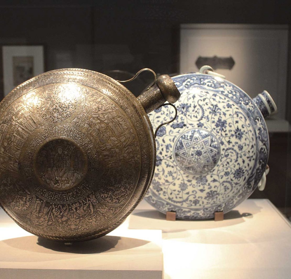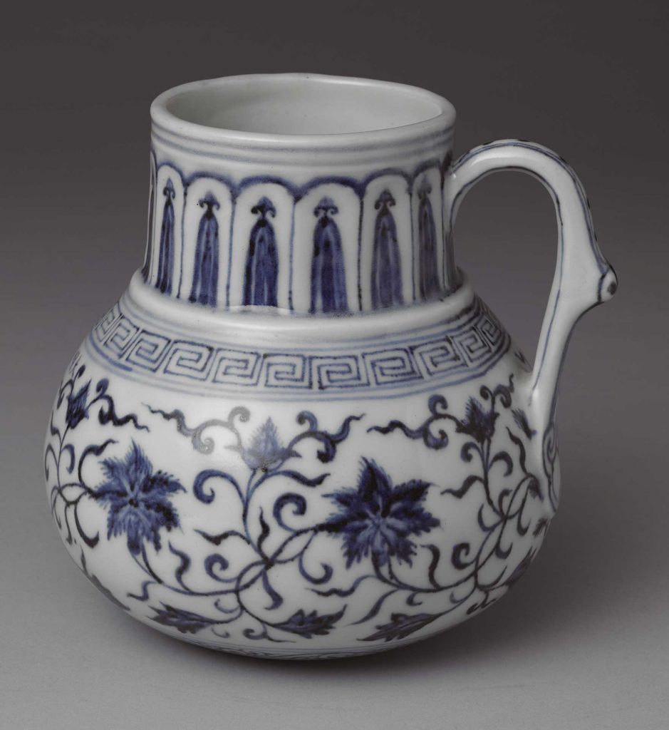 今日世界各地收藏中國藝術的博物館中,參觀者但凡遇到青花折沿盆/洗、無擋樽、花澆、八方燭臺、綬帶耳/如意耳扁壺、執壺,幾乎無例外地可將其器型來源判斷為伊斯蘭世界的黃銅金屬器。這些器型之所以在明代大量出現,離不開元明之際穆斯林在中國和中亞地區之間的活動。我們可以從實物的比對中一目了然地看到這種聯繫。