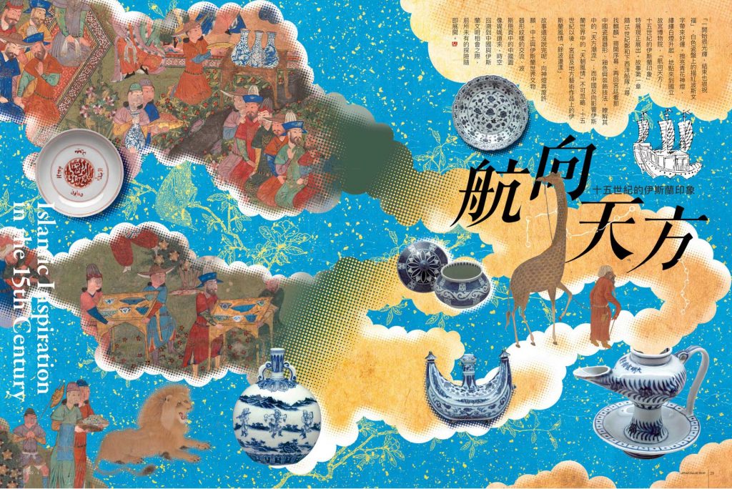 「一開始很光輝,結束也很祝福」,白色瓷盤上的描紅波斯文字帶來好運。擦亮青花神燈,縷縷白煙升起,地點來到國立故宮博物院,「航向天方─十五世紀的伊斯蘭印象」特展現正展出。故事第一章隨15世紀鄭和下西洋船隊「尋找麒麟」揭開序幕;再回宮廷看那中國瓷器器形、釉色與裝飾技法,瞭解其中的「天方潮流」;而中國反向影響伊斯蘭世界中的「天朝風情」不可忽略;十五世紀以後,宮廷及地方藝術作品上的伊斯蘭風情「餘波盪漾」。