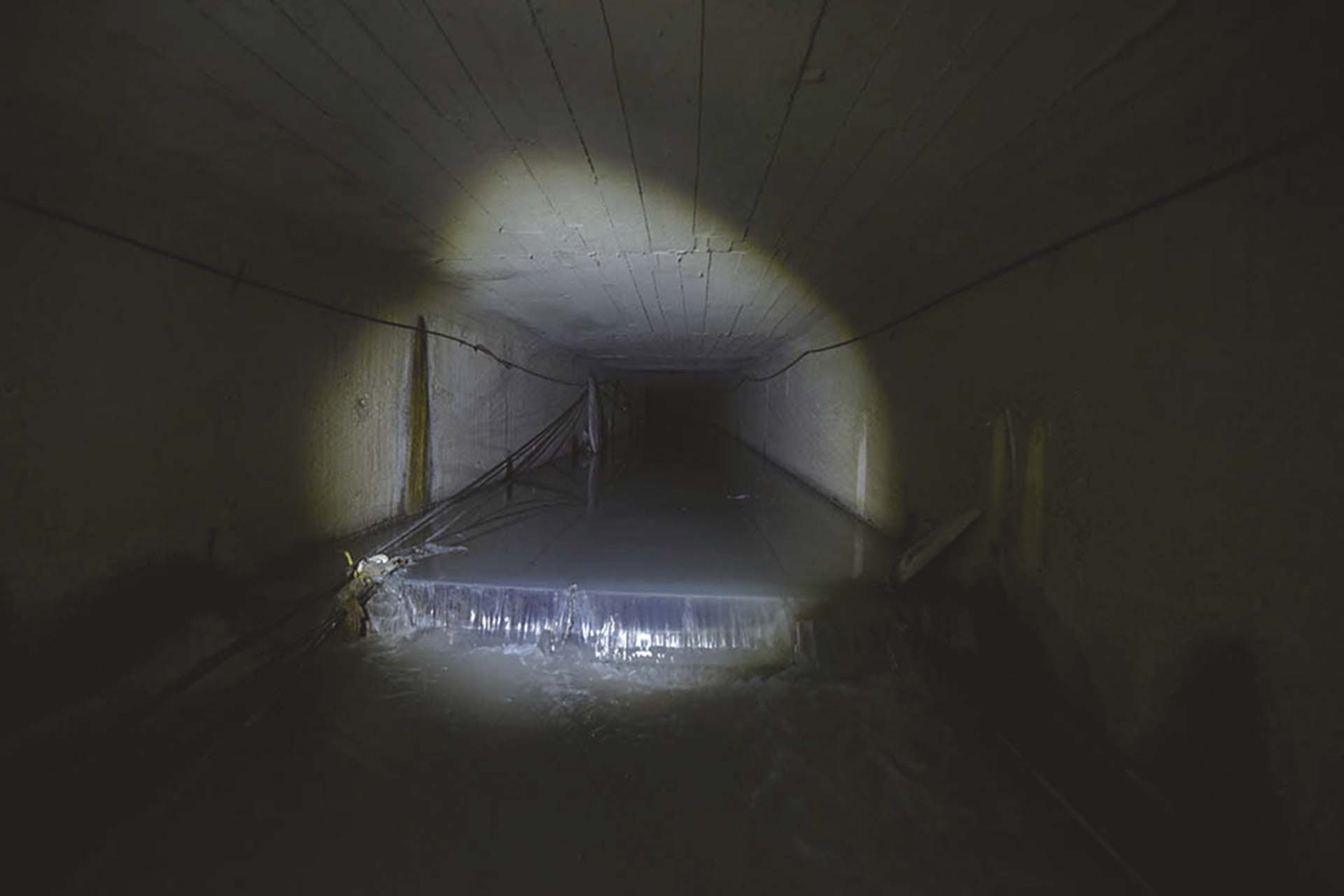 另一個例子是劉紀彤的《沿河》。透過結合身體姿勢之觀看與城市導覽行走,不斷內內外外地提醒觀者身體姿態與移動經驗的地誌學意涵。如果,在人類學家馬克.歐傑(Marc Augé)那裡,地方的定義是具歸屬感、包含人際關係且擁有歷史性,那麼一個不具歸屬感,沒有人際關係亦非歷史性的空間,即是種「非地方」(Non-Lieux)。劉紀彤探索的地底水道將是比「非地方」更為隱晦不明之場所;那裡不是廢墟,因為它持續運作著;不是過渡空間,因它毋須認證身分;它像廢墟那樣接納意義,但不是為了提供凝視,而是為了被排除;它像過渡空間那樣「被經過」,但不是為了出現於他方之移動,而是為了消失。於是,展場中《沿河》刻意以地面擺置投影的低姿態,提示即將潛行於地底世界的身體準備。藝術家記錄行走於都市下方水道與排水系統的過程(主要是柴頭港溪與竹溪源頭),在這個城市生活的厭棄空間中,影像與聲響暗示著黑暗的管道空間中彌漫的氣味與溫熱的濕度。在展場的小板凳上,我們坐得很低,在陰暗空間戴著耳機接收著被放大的細微聲響,猶如進入被壓抑的自我意識深處。